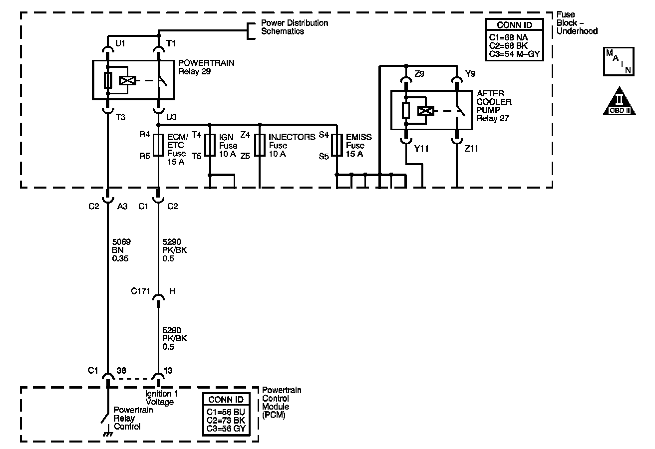 The powertrain relay is a normally open relay. The relay armature is held in the open position by spring tension. Battery positive voltage is supplied directly to the relay coil and the armature contact at all times. The powertrain control module (PCM) supplies the ground path to the relay coil control circuit, via an internal integrated circuit called an output driver module (ODM). When the PCM commands the relay ON, the relay coil creates an electromagnetic field. This electromagnetic field overcomes the spring tension and pulls the armature contact into the stationary contact of the relay load circuit. The closing of the relay contacts allows current to flow from the battery to the following fuses and relay: