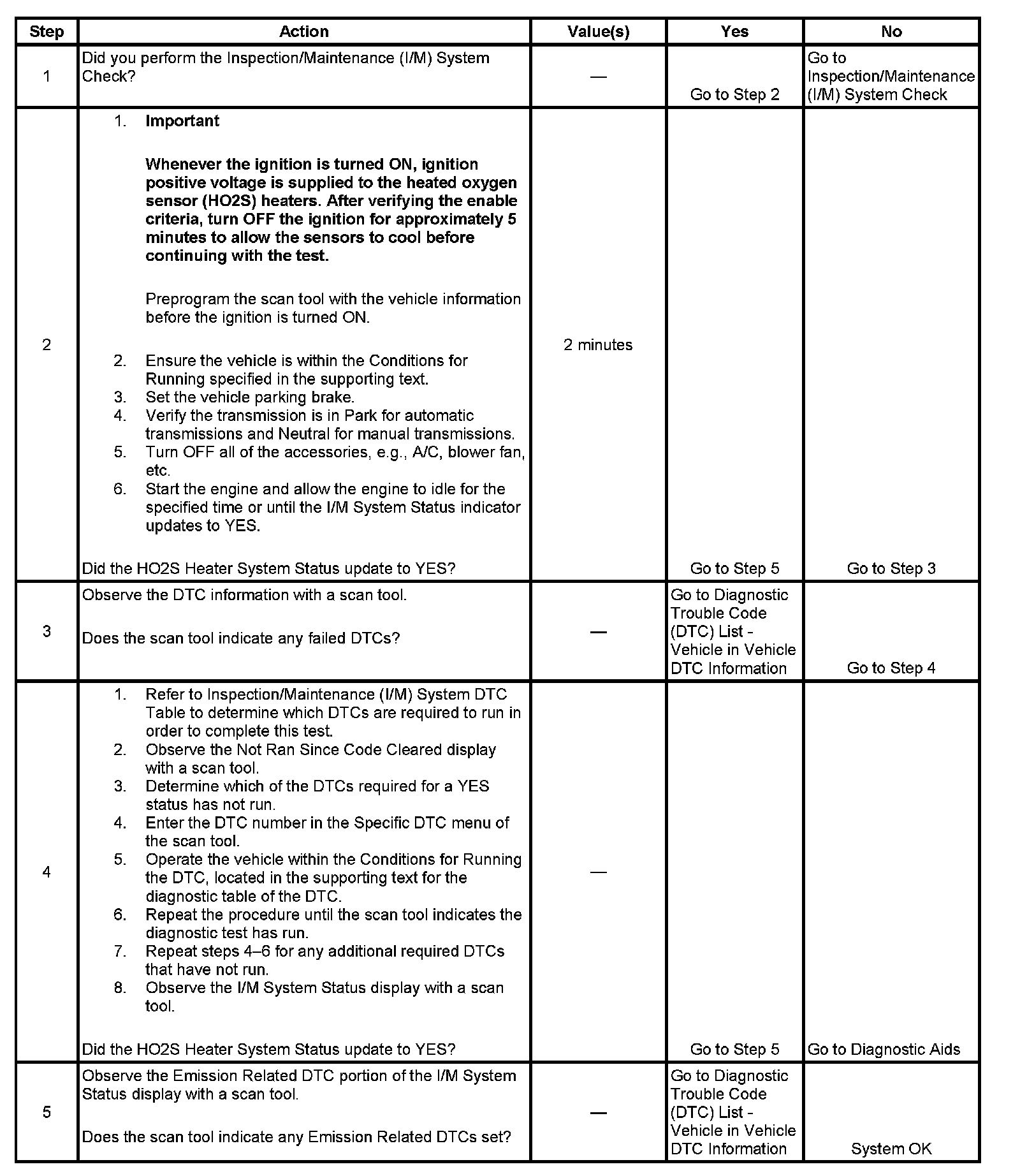 The purpose of this procedure is to satisfy the enable criteria necessary in order to execute the inspection/maintenance (I/M) readiness diagnostics for the Heated Oxygen Sensor (HO2S) Heater System. Ensure the vehicle meets the requirements listed in Conditions for Running before performing this test. Failure to meet the necessary requirements may produce inaccurate test results.
