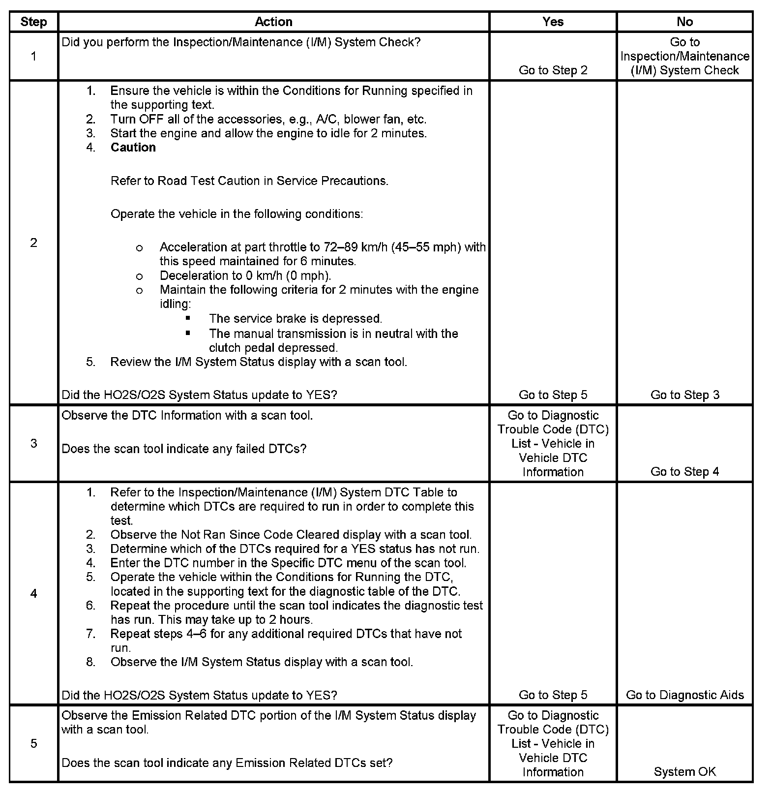 The purpose of this procedure is to satisfy the enable criteria necessary in order to execute the inspection/maintenance (I/M) readiness diagnostics for the Oxygen Sensor/Heated Oxygen Sensor (O2S/HO2S) System. Ensure the vehicle meets the requirements listed in Conditions for Running before performing this test. Failure to meet the necessary requirements may produce inaccurate test results.