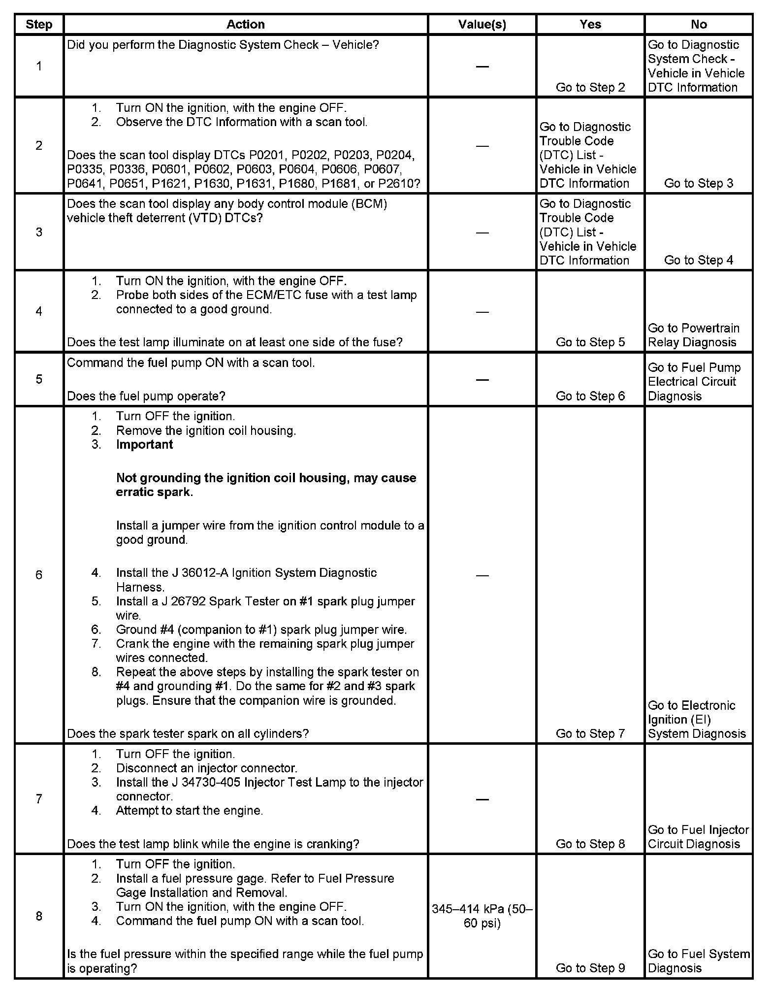 The Engine Cranks but Does Not Run diagnostic table is an organized approach to identifying a condition that causes an engine not to start. The Engine Cranks but Does Not Run diagnostic table directs the service technician to the appropriate system diagnosis.