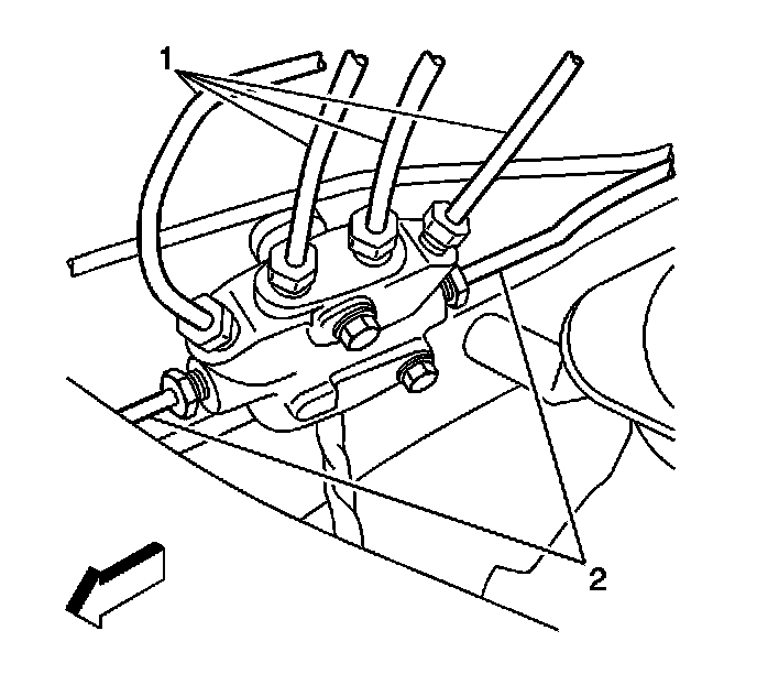 Important: Prior to disconnecting the brake pipes from the proportioning valve assembly, note the locations of the brake pipes to the valve assembly, to aid during installation.