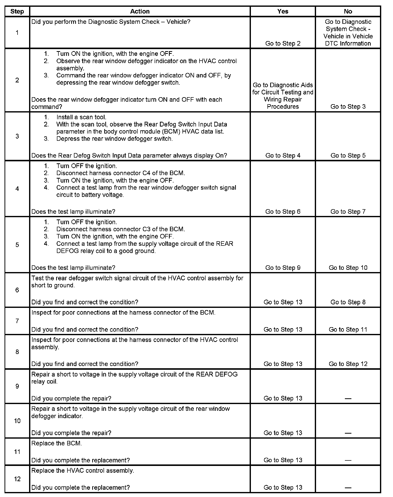 3. Command both the ON and OFF states of the rear window defogger switch. Repeat the command as necessary to verify the Rear Defog Switch Input data parameter does or doesn't change states.