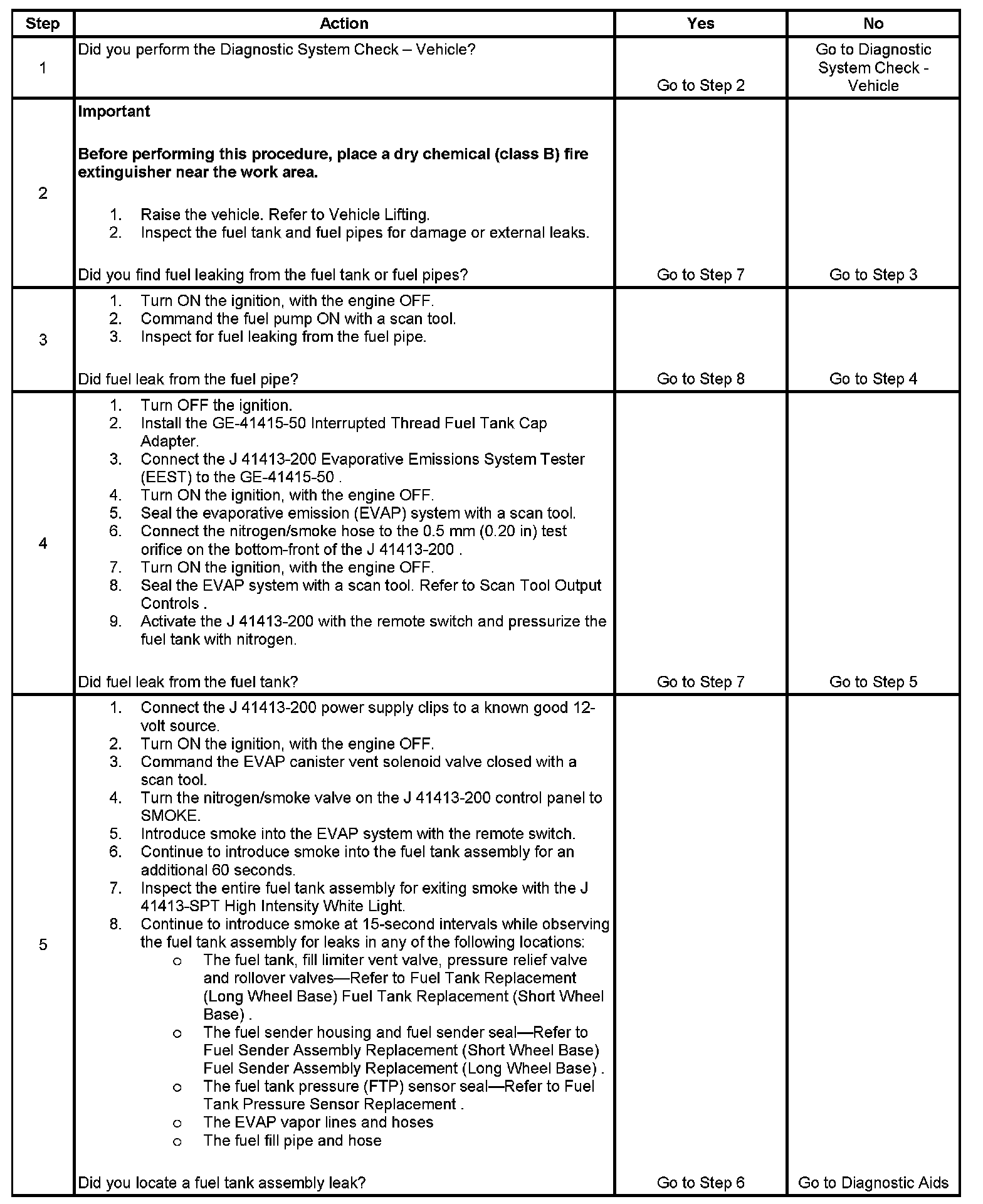 The fuel tank leak test is used to locate any fuel or fuel vapor escaping the fuel tank area. Fuel vapors escaping above the fuel level will be detected when the evaporative emissions (EVAP) diagnostics complete one test cycle. The malfunction indicator lamp (MIL) will illuminate after the EVAP diagnostics complete 2 test cycles.