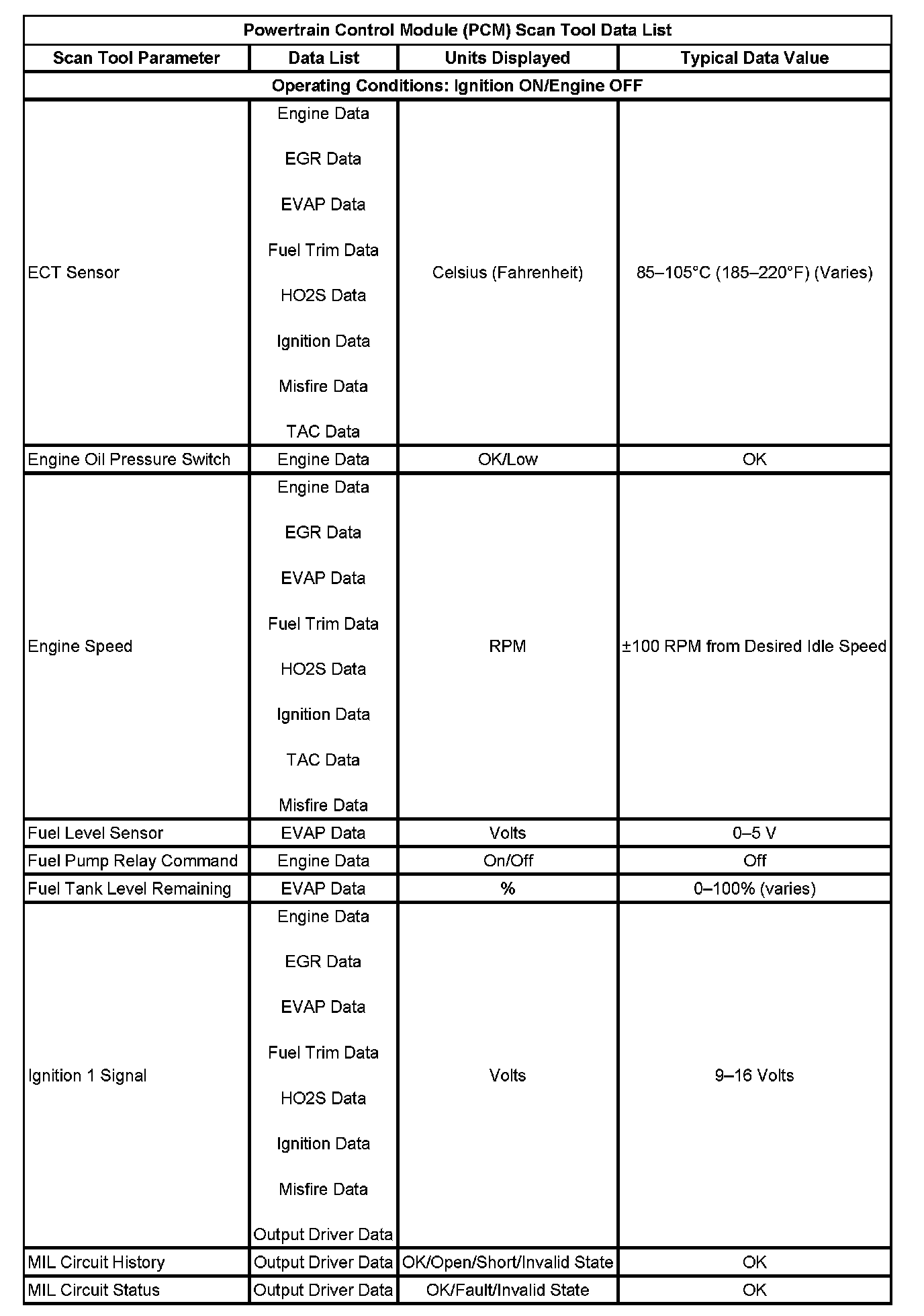 Scan Tool Data List - Powertrain Control Module (PCM)