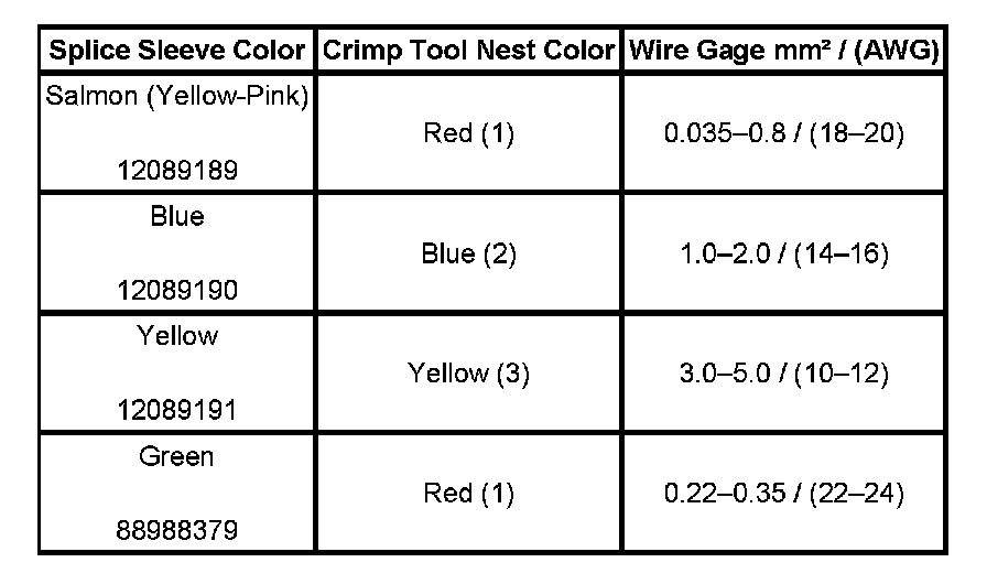 4. Select the proper DuraSeal splice sleeve according to the wire size. Refer to the above table at the beginning of the repair procedure for the color coding of the DuraSeal splice sleeves and the crimp tool nests.