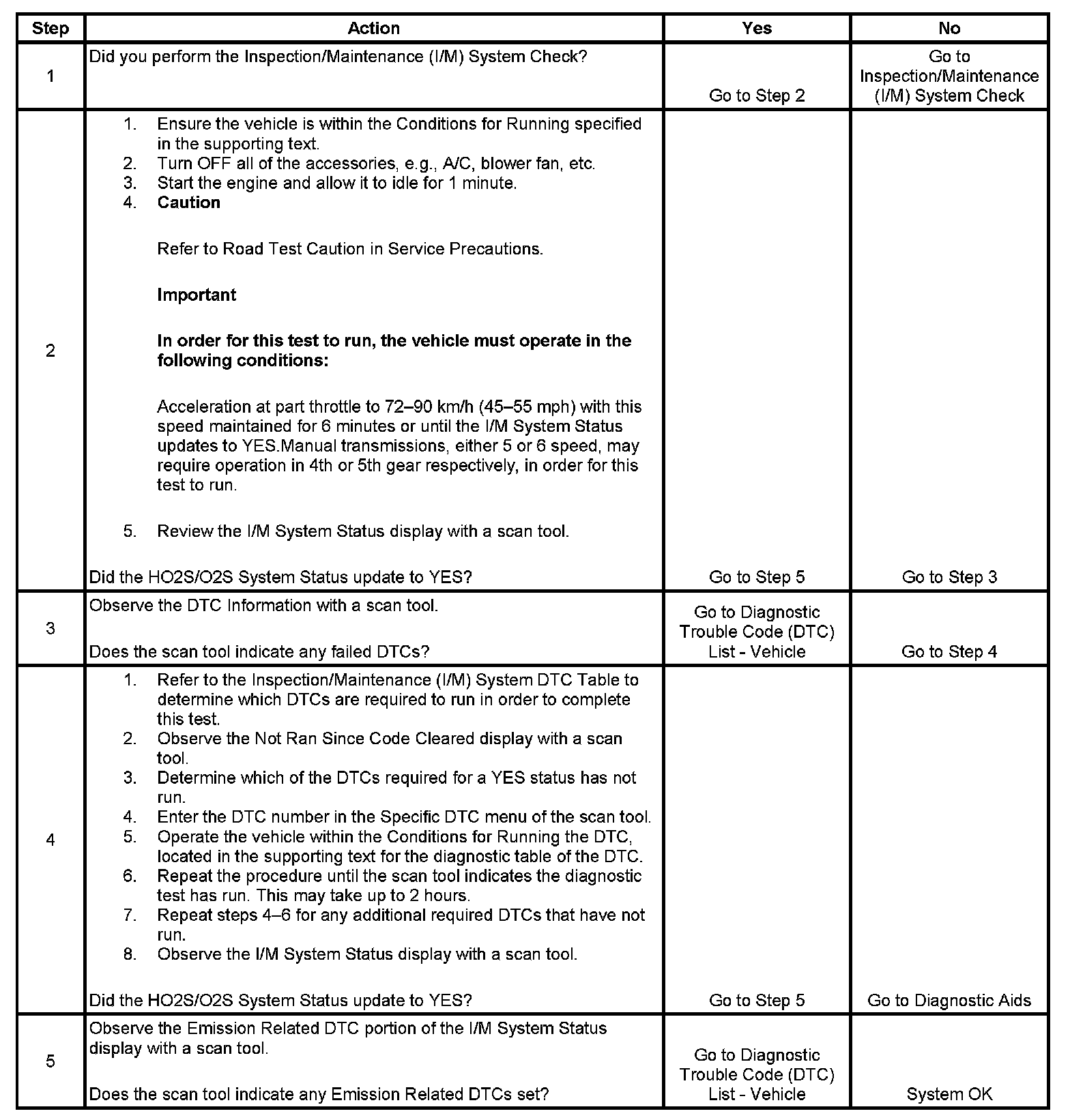 The purpose of this test is to satisfy the enable criteria necessary to execute inspection/maintenance (I/M) readiness diagnostics for the heated oxygen sensor (HO2S)/oxygen sensor (O2S) system. The test may be used to set the I/M System Status to YES. The I/M System Status display on the scan tool provides an indication of whether the control module has completed the required test. The required test is complete when either all of the DTCs comprising the test have run and passed, or when any one of the DTCs comprising the test has illuminated the malfunction indicator lamp (MIL). Once the test is complete, the I/M System Status display will indicate YES in the Completed column.
