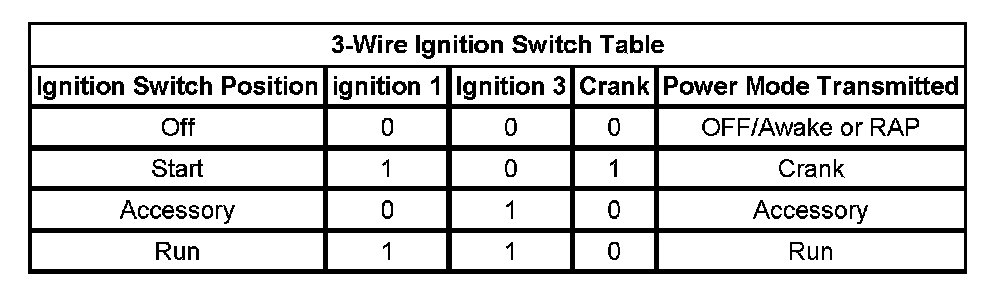On vehicles that have several control modules connected by serial data circuits, one module is the power mode master (PMM). On this vehicle, the PMM is the body control module (BCM). The PMM receives 3 discrete ignition switch signals to differentiate which power mode will be sent over the Serial Data circuits. The table illustrates the state of these inputs in correspondence to the ignition switch position:
