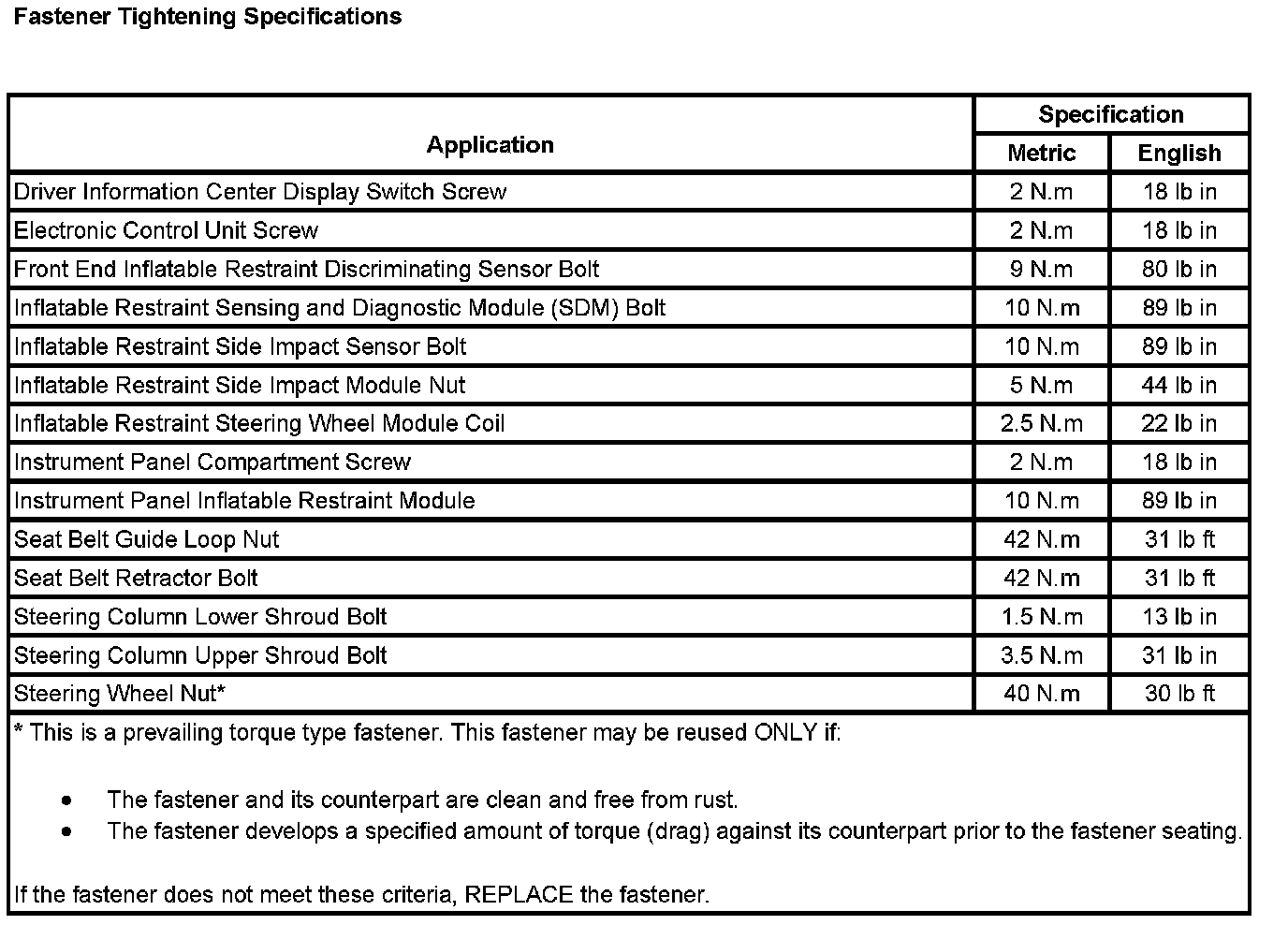 Fastener Tightening Specifications: