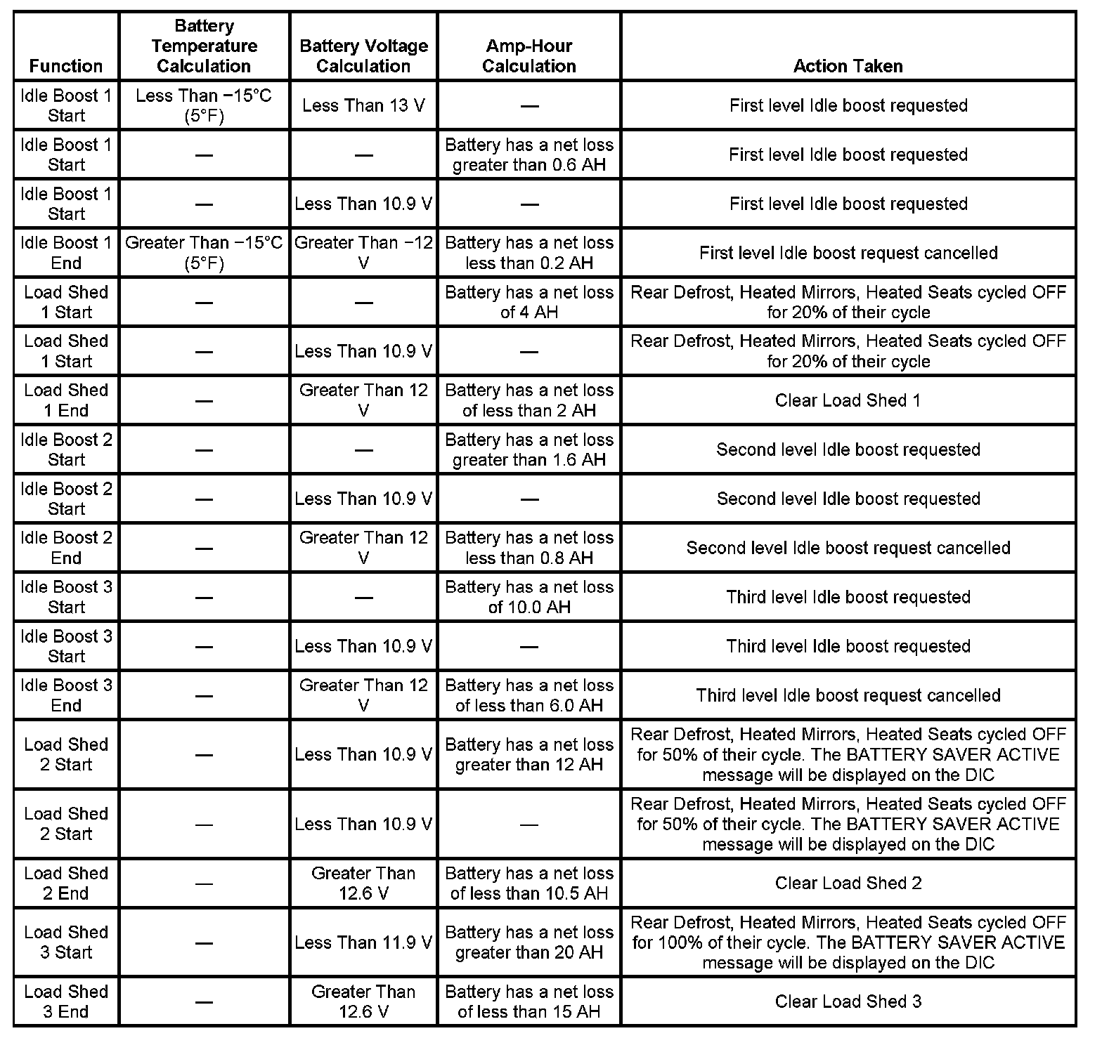 Each EPM function, either idle boost or load shed, is discrete. No 2 functions are active at the same time. Idle boost is activated in incremental steps, idle boost 1 must be active before idle boost 2 can be active. The criteria used by the body control module (BCM) to regulate EPM are outlined: