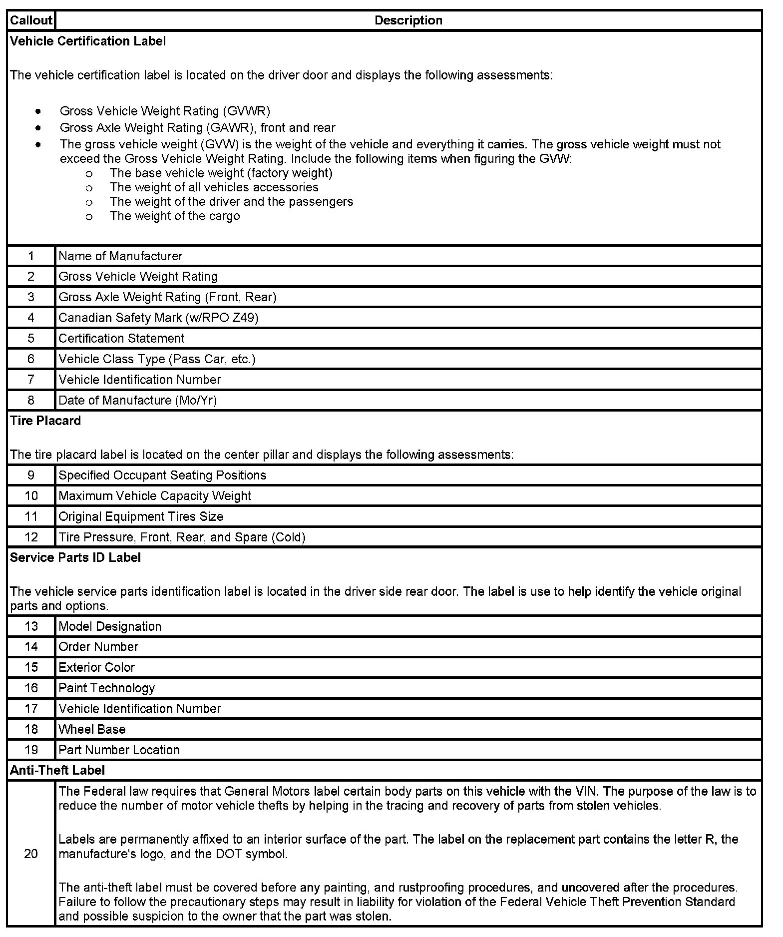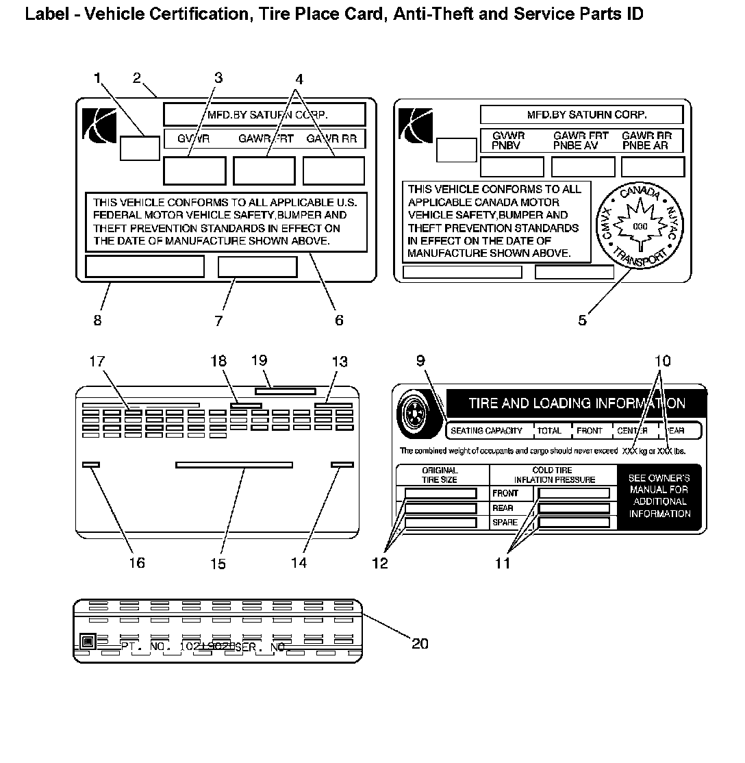 Label - Vehicle Certification, Tire Place Card, Anti-Theft And Service Parts ID: