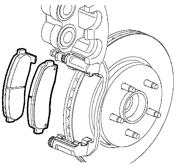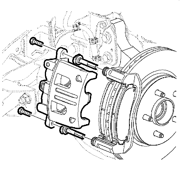 1. Notice: Support the brake caliper with heavy mechanic's wire, or equivalent, whenever it is separated from its mount and the hydraulic flexible brake hose is still connected. Failure to support the caliper in this manner will cause the flexible brake hose to bear the weight of the caliper, which may cause damage to the brake hose and in turn may cause a brake fluid leak.