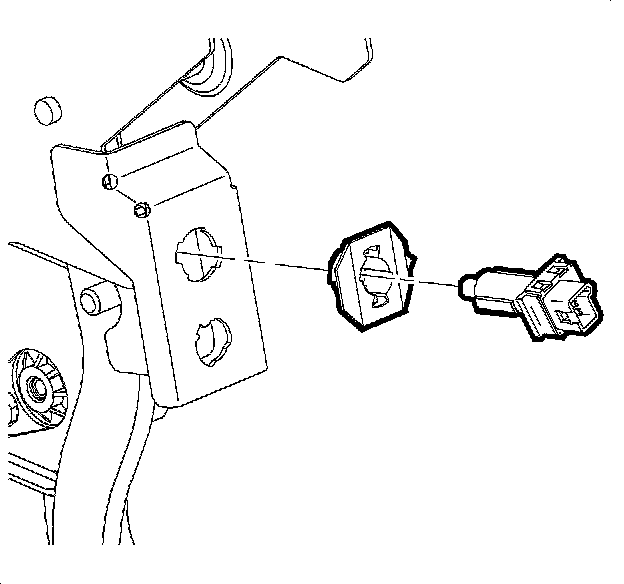 1. Install the cruise brake switch retainer into the upper hole of the brake pedal assembly with the retainer arrow pointing in the 3 o'clock position.