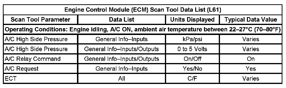 The scan tool data values were taken from a known good vehicle under the following conditions:
