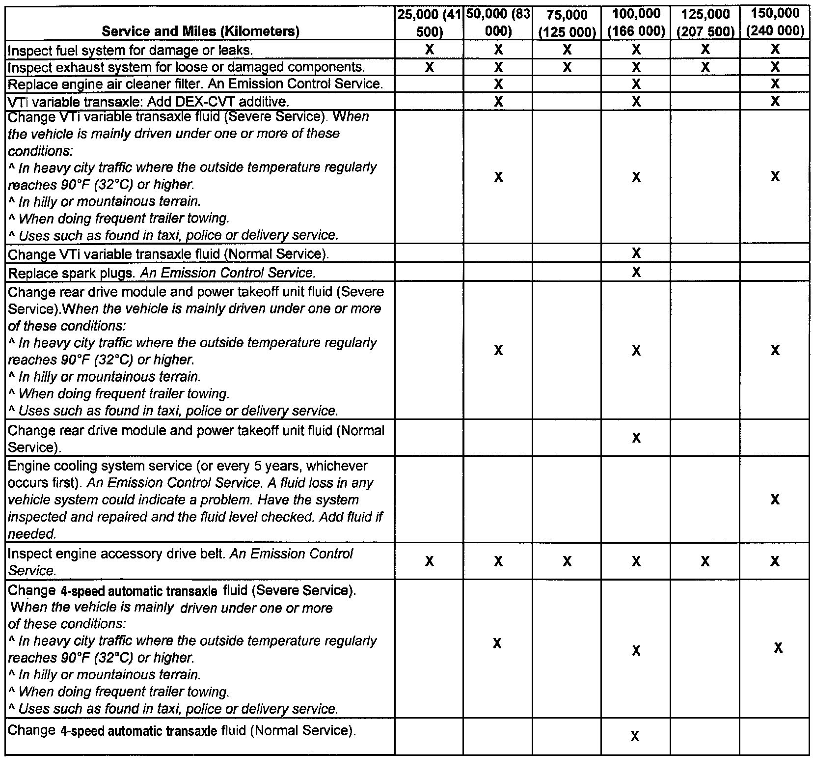 (Maintenance I or Maintenance II) after the indicated kilometers (miles) shown for each item.