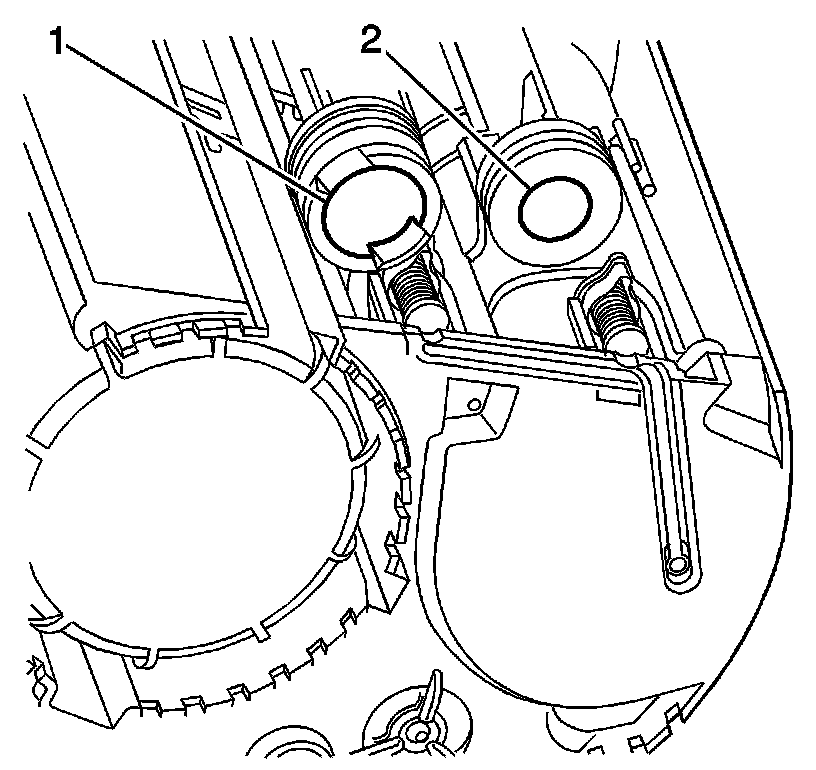 The primary jet pump (1) is located in the primary fuel tank module. Fuel pump flow loss, caused by vapor expulsion in the pump inlet chamber, is diverted to the primary jet pump and the secondary jet pump (2) through a restrictive orifice located on the pump cover. The primary jet pump fills the reservoir of the primary fuel tank module.