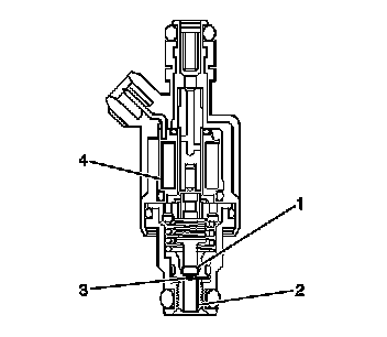 The fuel injector assembly is a solenoid device controlled by the control module that meters pressurized fuel to a single engine cylinder. The control module energizes the high-impedance, 12 ohm, injector solenoid (4) to open a normally closed ball valve (1). This allows fuel to flow into the top of the injector, past the ball valve, and through a director plate (3) at the injector outlet. The director plate has machined holes that control the fuel flow, generating a spray of finely atomized fuel at the injector tip. Fuel from the injector tip is directed at the intake valve, causing the fuel to become further atomized and vaporized before entering the combustion chamber. This fine atomization improves fuel economy and emissions.