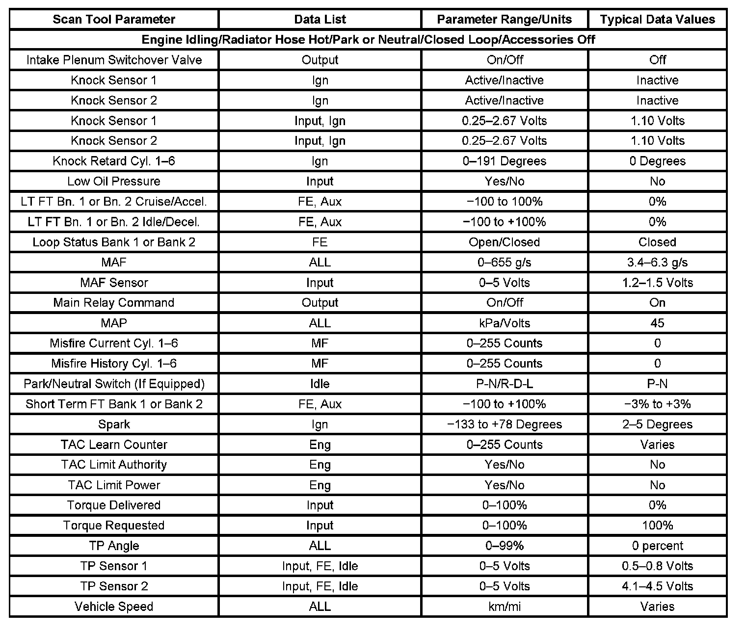 The Engine Scan Tool Data List contains all engine related parameters that are available on the scan tool. The list is arranged in alphabetical order. A parameter may appear in any one of the data lists, and in some cases may appear more than once, or in more than one data list in order to group certain related parameters together.