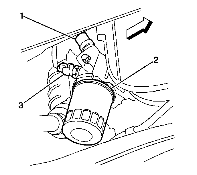 The flow of oil thru the rocker shafts to the rocker arms is controlled by the rocker arm oil control solenoid. A rocker arm oil pressure switch monitors the operation of the oil control solenoid. The rocker arm oil control solenoid (1) and the oil pressure switch (3) are located near the engine oil filter (2) on the lower right rear corner of the engine.