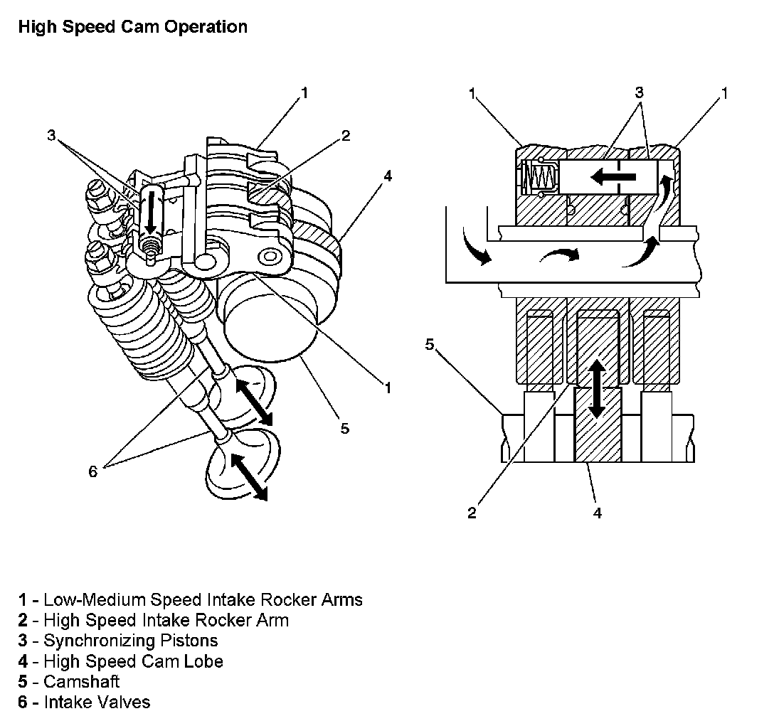 When engine speed exceeds 4,400 RPM engine oil is allowed to flow unobstructed to the rocker arms. This flow of oil into the rocker arm oil passages creates an increase in oil pressure. The increase in oil pressure moves the synchronizing pistons (3) further into their bores, compressing the piston spring. As the spring is compressed, the shifted pistons lock all three rocker arms together (1 and 2). When locked together, the low-medium speed rocker arms (1) follow the movement of the high speed rocker arm (2). Because the high speed rocker arm (2) is following the high speed cam lobe (4), the intake valves (6) open with more lift.