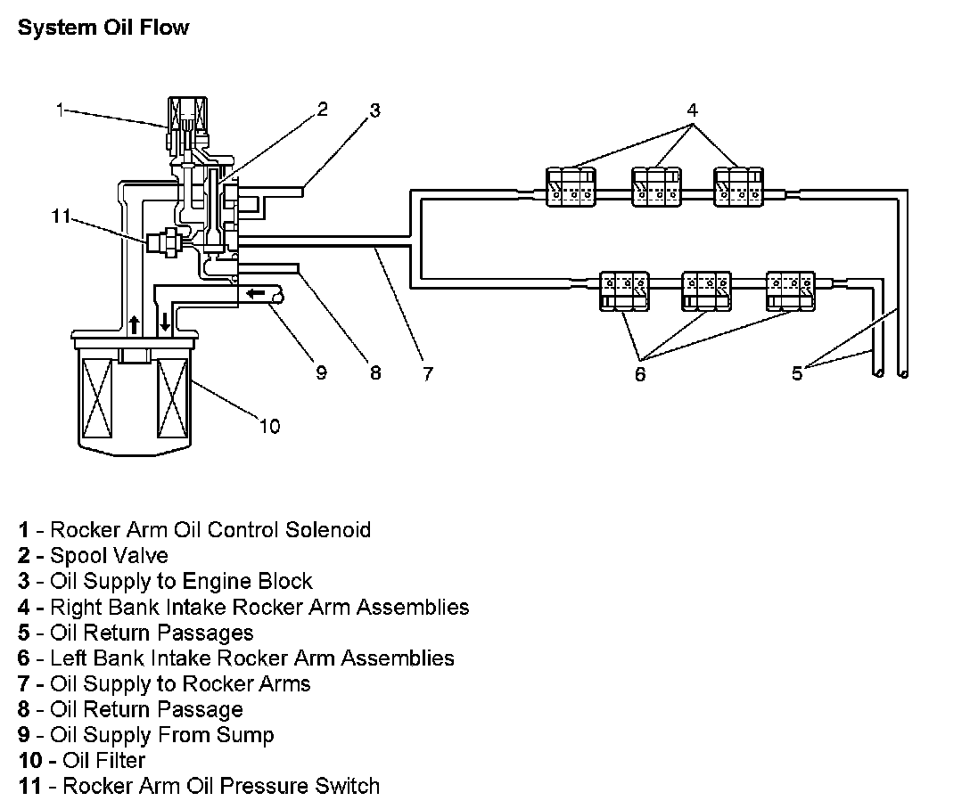 The flow of engine oil thru the rocker shafts to the intake rocker arms (4 and 6) is controlled by the rocker arm oil control solenoid (1). The oil control solenoid (1) has a plunger that moves a spool valve (2) located in the path of the rocker arm oil supply (7). When the oil control solenoid is energized, the spool valve is positioned to allow maximum oil flow to the intake rocker arms. Because of the restriction to full oil flow in the rocker arm oil passages, oil pressure increases. Excess oil is returned to the oil pan thru the oil return passages (5). The rocker arm oil pressure switch (11) detects oil pressure when the rocker arm oil control solenoid (1) is ON. The oil pressure switch input enables the engine control module to monitor the operation of the rocker arm oil control solenoid.