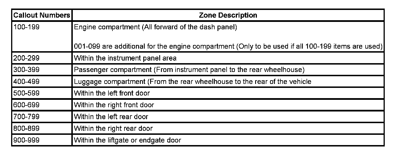 All grounds, in-line connectors, pass-through grommets, and splices have identifying numbers that correspond to where they are located in the vehicle. The following table explains the numbering system.