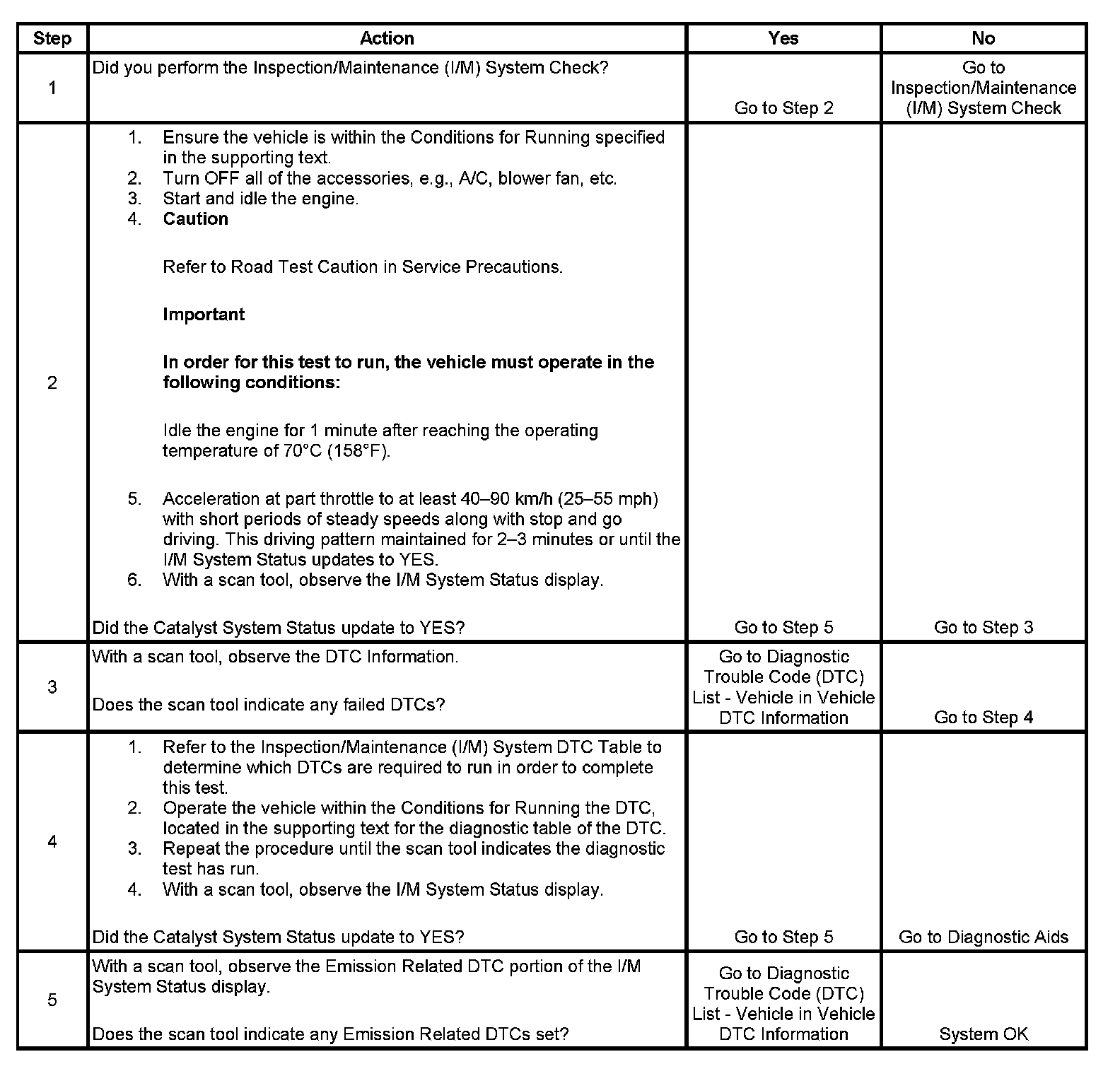 3. This step is to identify a first failure of a type B DTC. A DTC only appears on the I/M System Status display when the DTC becomes a MIL illuminating DTC. This occurs on the second failure of a type B DTC. A first failure of a type B DTC will not allow the I/M System Status to update to YES. Refer to Diagnostic Aids.