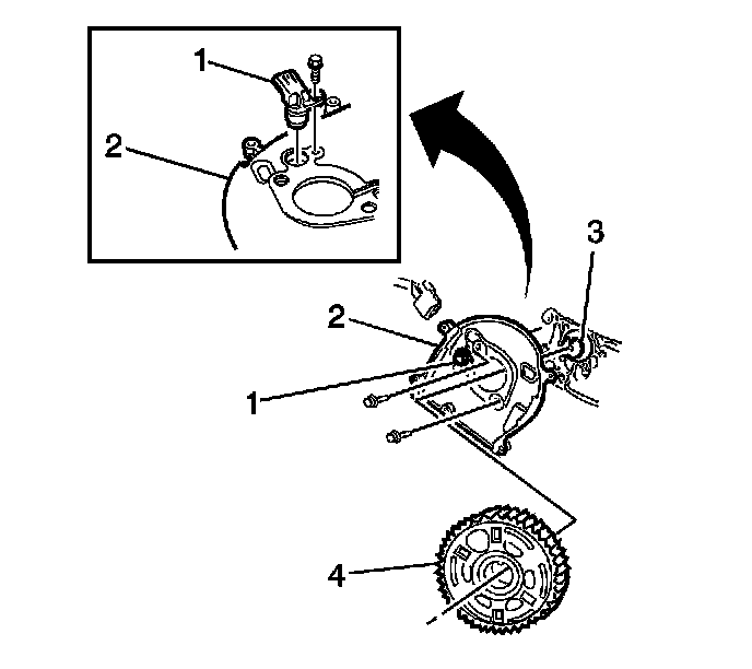 The camshaft position (CMP) sensor (1) is fastened to the backside of the timing belt cover (2) of the left bank cylinder head. The cam gear (4) is attached to the left bank camshaft (3) inside the timing belt cover (2). The CMP sensor signal rotor is integral to the cam gear (4). The signal rotor has three unevenly spaced teeth. When each tooth of the signal rotor moves past the CMP sensor (1), an electrical signal is generated. These AC signals, three per camshaft revolution, are sent to the PCM.
