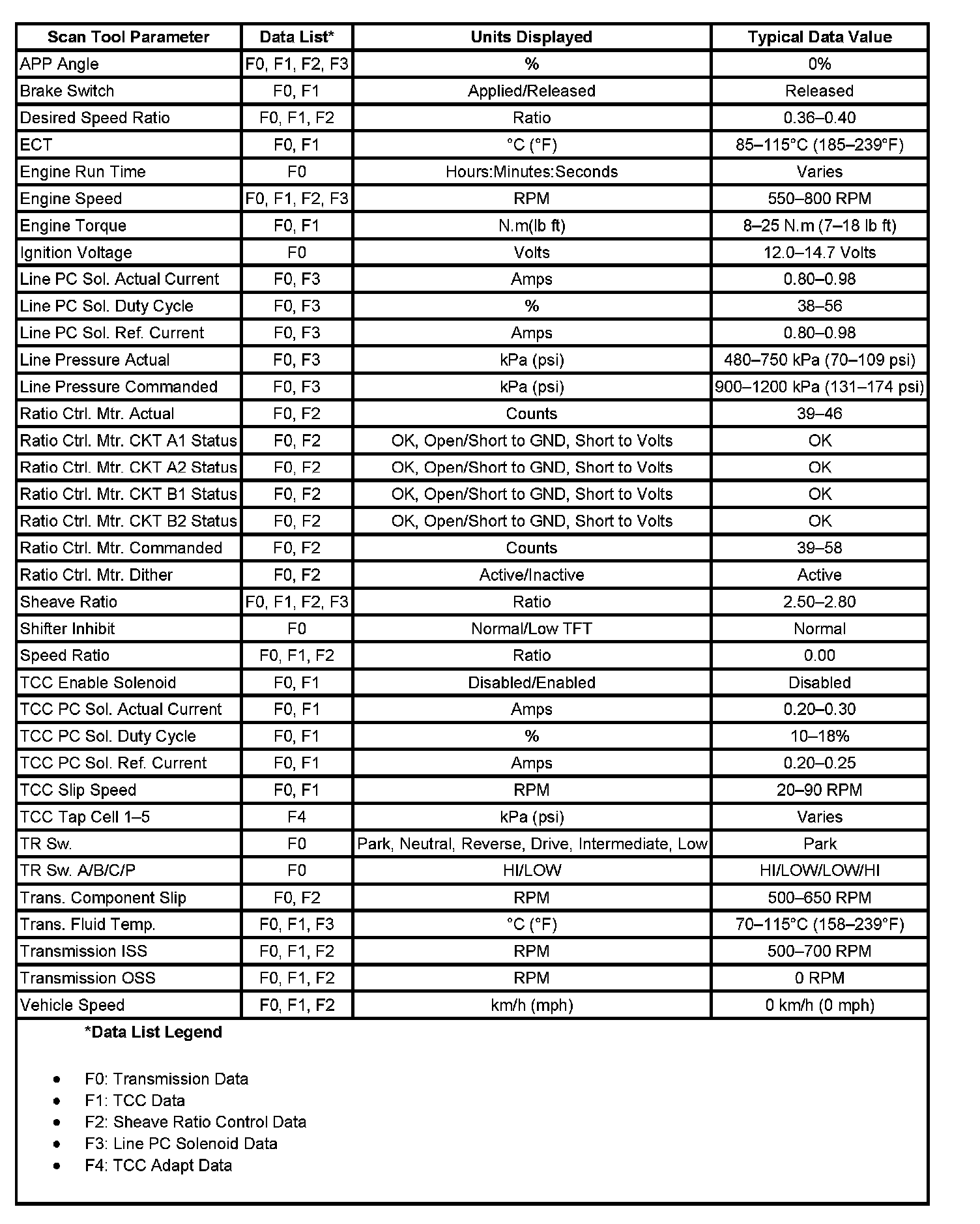 Only the parameters listed below are used in this service manual for diagnosing. If a scan tool displays other parameters, the values are not recommended by General Motors for use in diagnosis.