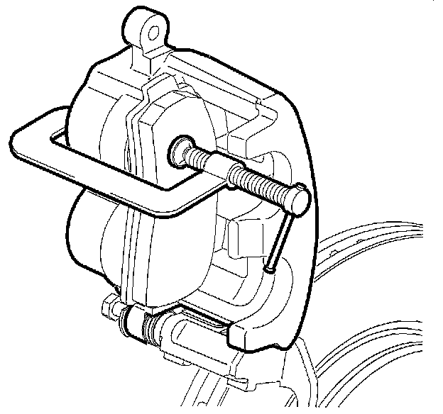 1. Install a large C-clamp over the body of the brake caliper, with the C-clamp ends against the rear of the caliper body and against an old inboard brake pad or a wood block installed against the caliper piston.