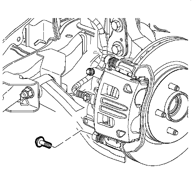 11. Notice: Support the brake caliper with heavy mechanic's wire, or equivalent, whenever it is separated from its mount and the hydraulic flexible brake hose is still connected. Failure to support the caliper in this manner will cause the flexible brake hose to bear the weight of the caliper, which may cause damage to the brake hose and in turn may cause a brake fluid leak.
