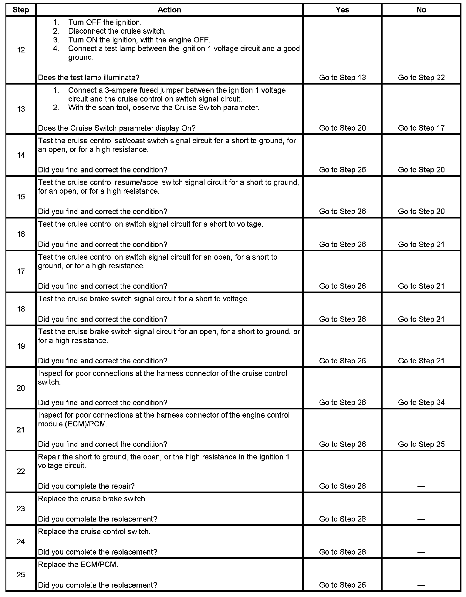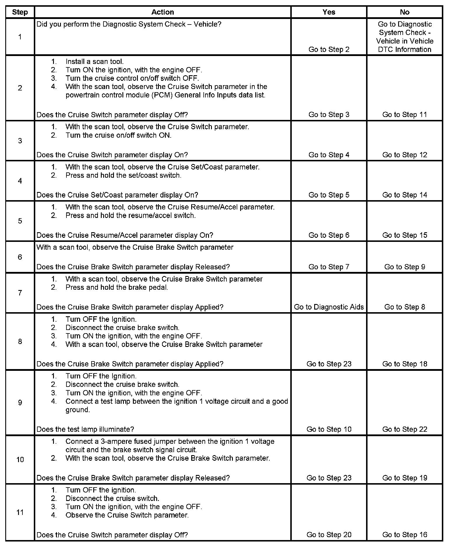 3. Observe the cruise set/coast and cruise resume/accel parameters in the scan tool PCM General Info Inputs data list while rotating the steering wheel to both stops and pressing and holding the steering wheel control switches. This will eliminate the possibility of a internally open or shorted inflatable restraint steering wheel module coil.