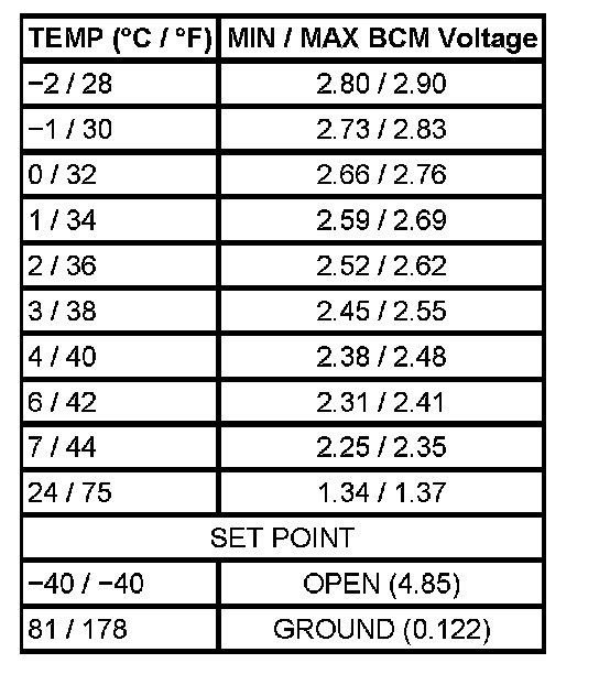The refrigerant temperature at the temperature sensor in the thermal expansion valve (TXV) controls cycling of the compressor clutch to prevent freezing of the evaporator core. The compressor is disabled when the temperature goes below 3 °C (37 °F) and vehicle speed is greater than 8 km/h (5 mph). The compressor is enabled when the temperature exceeds 4 °C (40 °F). The minimum cycling time off is 4 seconds. For purposes of converting a voltage to a temperature value in the diagnosis of the temperature sensor located within the TXV at the inlet outlet of the Evaporator the conversion chart has been inputted.