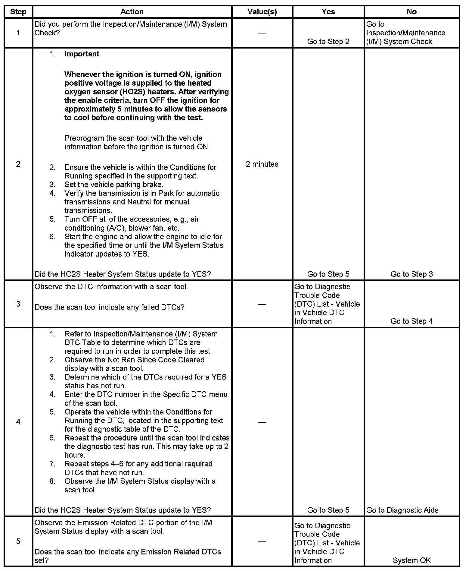 The purpose of this test is to satisfy the enable criteria necessary to execute inspection/maintenance (I/M) readiness diagnostics for the heated oxygen sensor (HO2S) heater system. The test may be used to set the I/M System Status to YES. The I/M System Status Display on the scan tool provides an indication of whether the control module has completed the required tests. The I/M System Status does not indicate that the tests have passed or failed. When all of the diagnostics for a specific system have run and passed the I/M System Status will update to YES. If a test for a specific system has failed, the I/M System Status will update to YES, indicating a determination was made, even if all of the other tests for that system have not run.