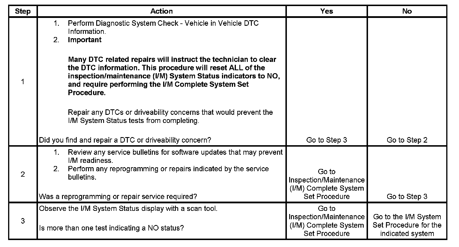 For the specific DTCs required for each system, refer to Inspection/Maintenance (I/M) System DTC Table. Systems such as fuel delivery, misfire, and comprehensive components may not be listed in a system status list. These tests run continuously and do not require an I/M System Status indicator. Inspection/Maitenance (I/M) System (DTC) Table