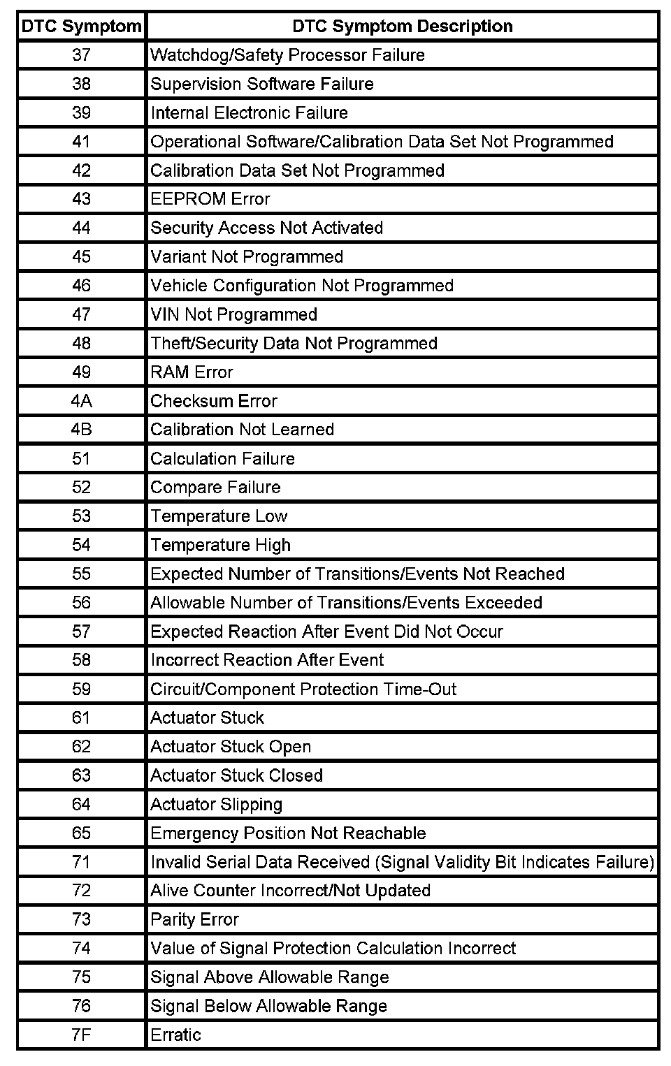 A DTC symptom is a 2-digit number which adds additional detail to a DTC. The DTC symptom provides additional information without requiring a large increase in the number of new DTCs.