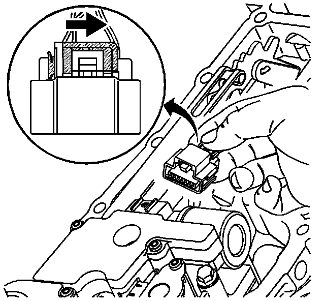 3. Press the connector tab and remove the connector for the input and output speed sensor assembly from the control valve body assembly.