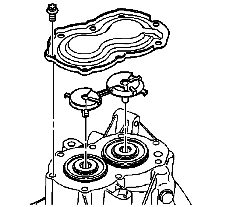 11. Install the output shaft bearing race and bolts using the J 44387-1 (2), J 44387-2 (3), and the J 7079-2 (1).