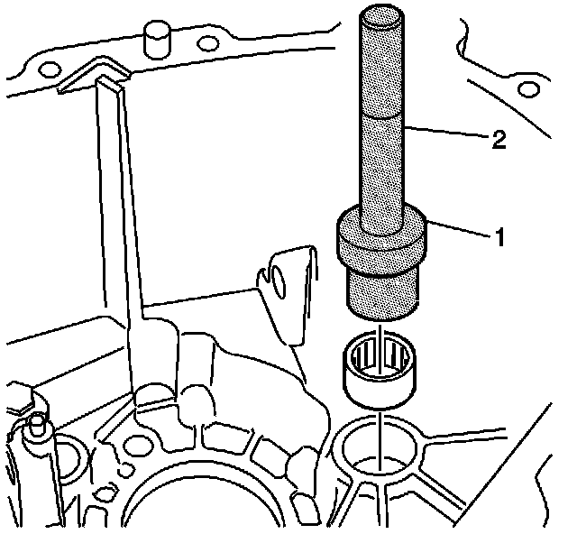 2. Install the intermediate shaft needle bearing to the transmission housing using the J 44383 (1) and the J 8092 (2).