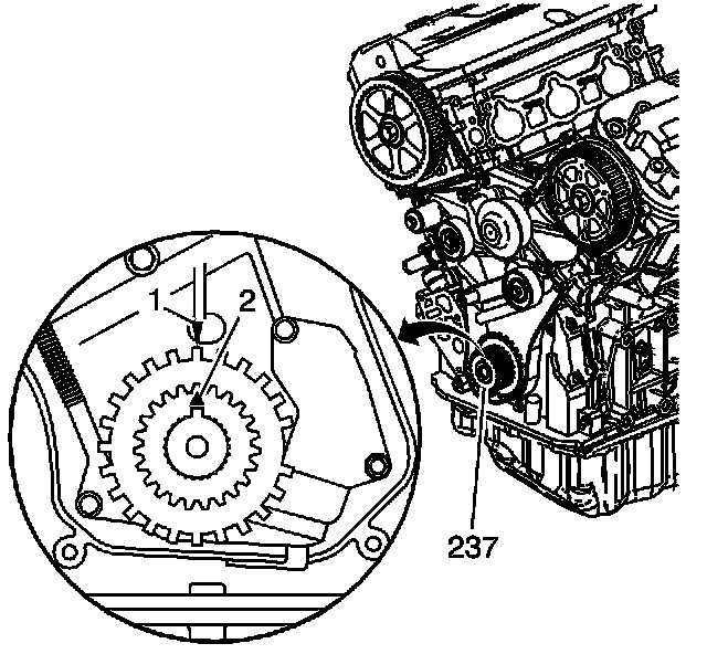 2. Rotate the crankshaft and align the top dead center (TDC) mark (2) on the sprocket (237) with the pointer on the oil pump housing (1).