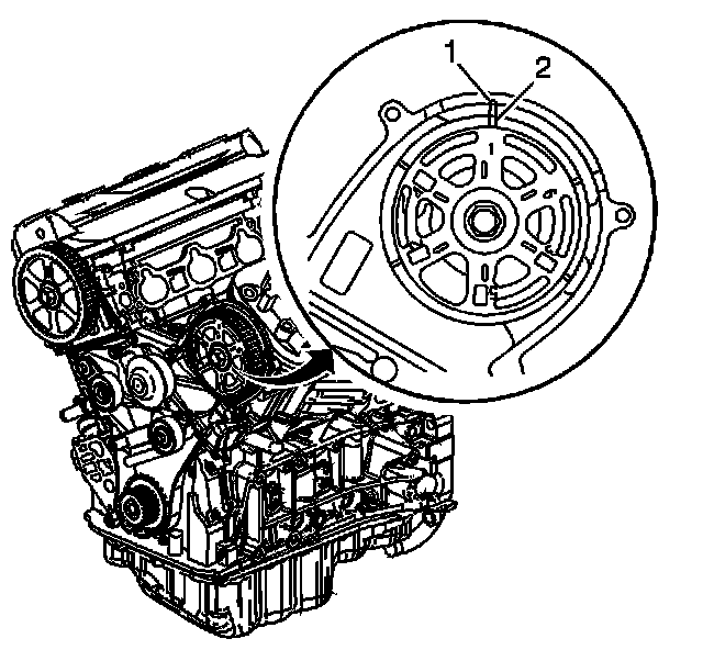 13. Inspect the left camshaft sprocket for proper alignment. The TDC mark (2) on the sprocket should align with the pointer (1) on the cover.