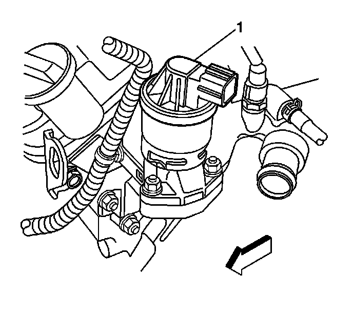 The EGR valve (1) is located on the left corner of the front engine bank. The valve uses a stepper motor to drive a worm gear. The worm gear is in mesh with a plunger that controls the exhaust gas passage opening. Plunger movement is monitored by a position sensor. The powertrain control module (PCM) uses a pulse width modulated (PWM) signal to operate the stepper motor. By rotating the stepper motor in different directions, the PCM controls the opening of the exhaust gas passage to the intake manifold.