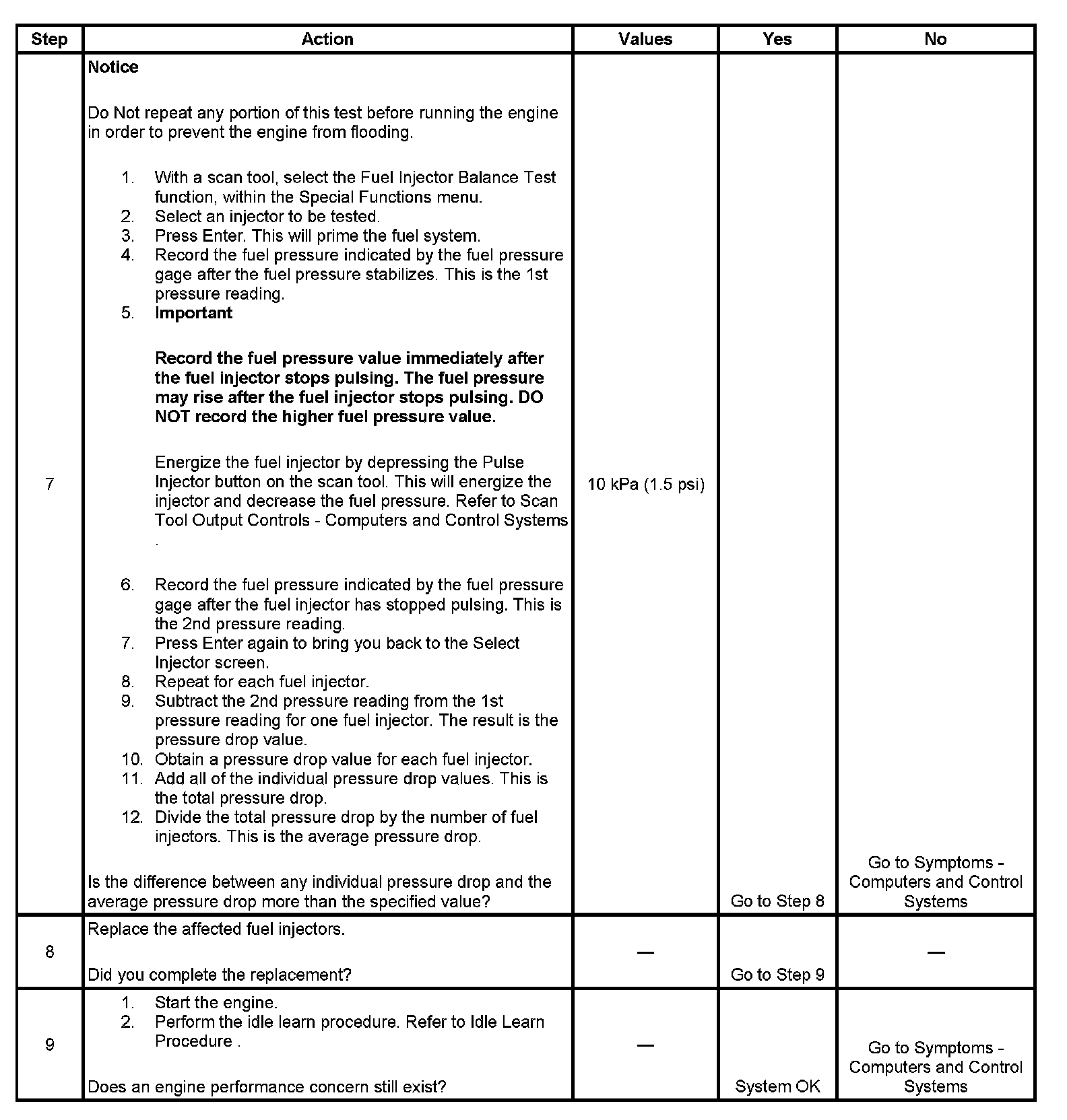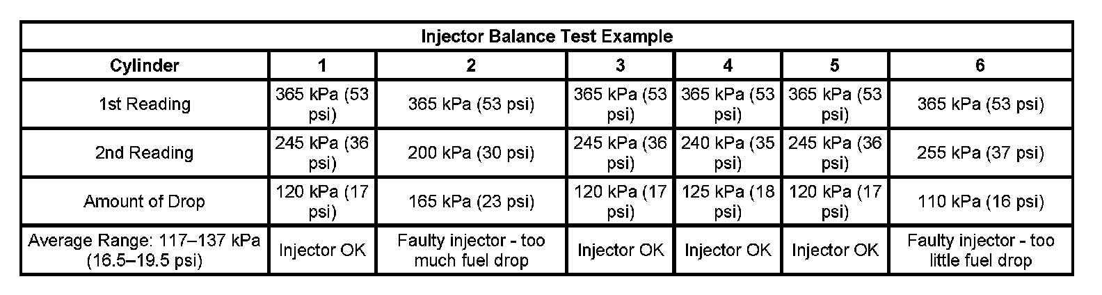 7. The fuel injectors are flowing properly if the pressure drop value for each fuel injector is within 10 kPa (1.5 psi) of the average pressure drop value. Calculate the pressure drop value for each fuel injector by subtracting the second pressure reading from the first pressure reading. Refer to the examples in the preceding table.