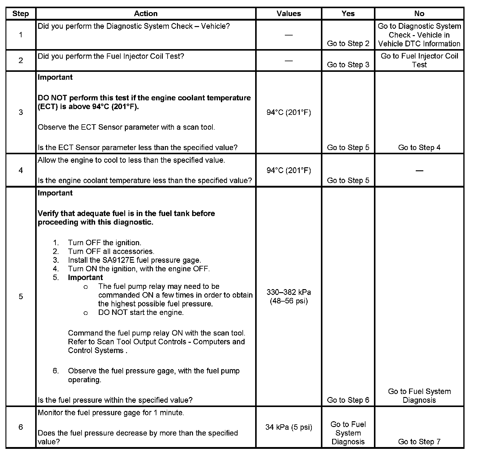 5. This step checks that the fuel pressure is within the specified operating range of this fuel system.