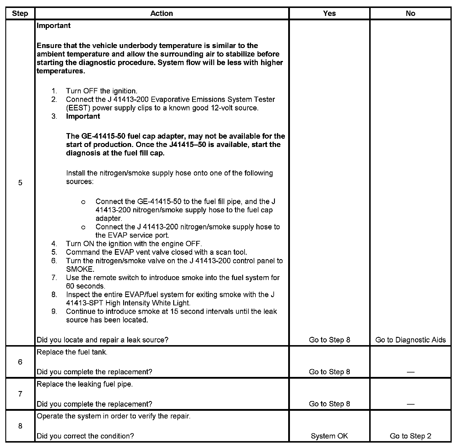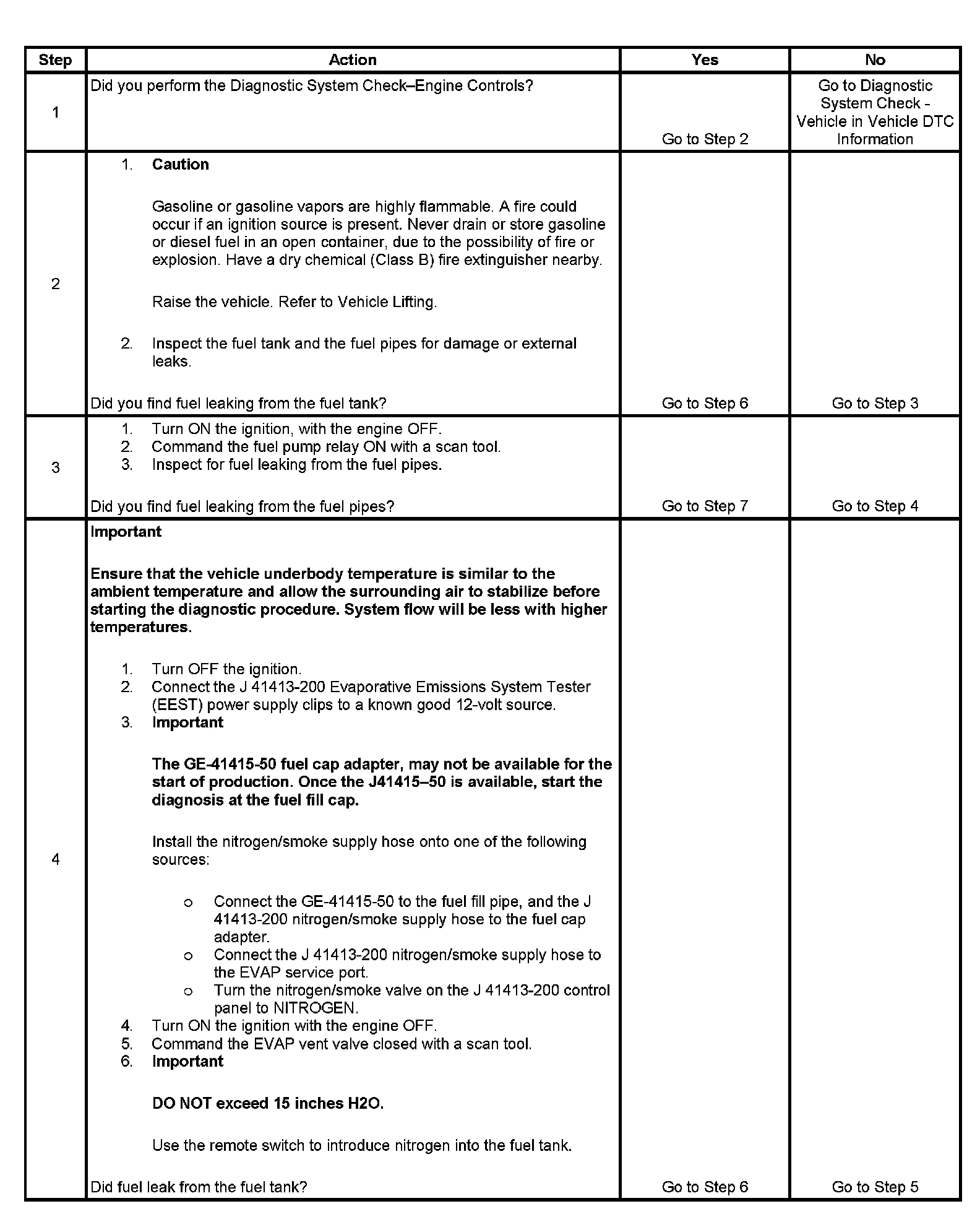 The fuel tank leak test is used to locate any fuel or fuel vapor escaping the fuel tank area. Fuel vapors escaping above the fuel level will be detected when the evaporative emission (EVAP) diagnostics complete one test cycle. The malfunction indicator lamp (MIL) will illuminate after the EVAP diagnostics complete two test cycles.