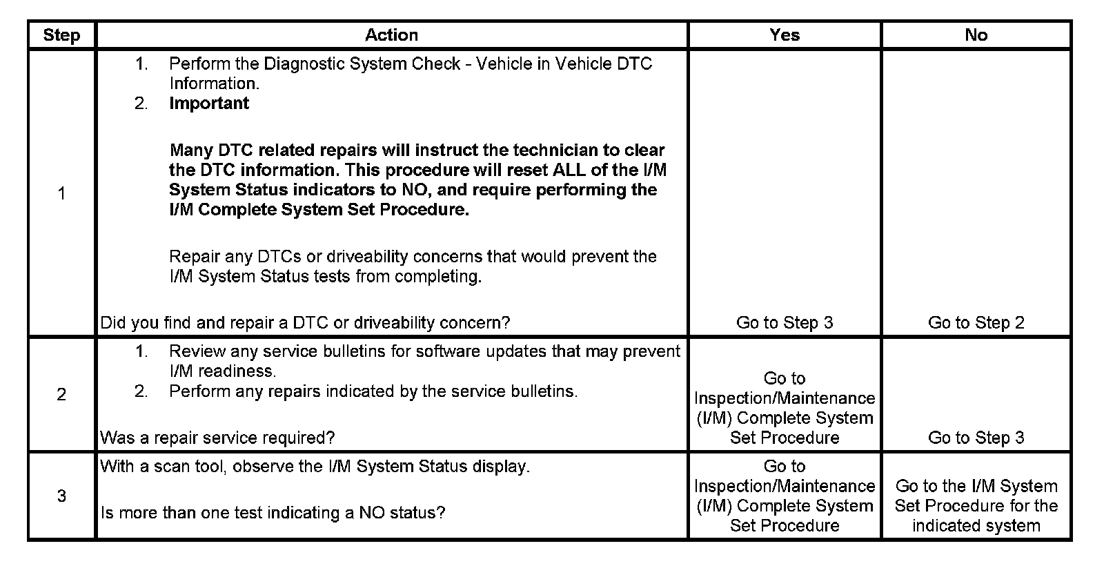 1. Any DTCs set, even those that are not listed in the Inspection/Maintenance System DTC Table, may prevent the required DTCs from running. If there is any question as to whether a set DTC is disabling the required I/M diagnostic, review the Conditions for Running in the diagnostic procedures for the DTC required by the I/M diagnostic. A list of disabling DTCs, if applicable, is contained in the supporting text for that DTC.