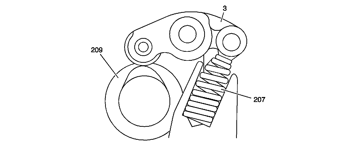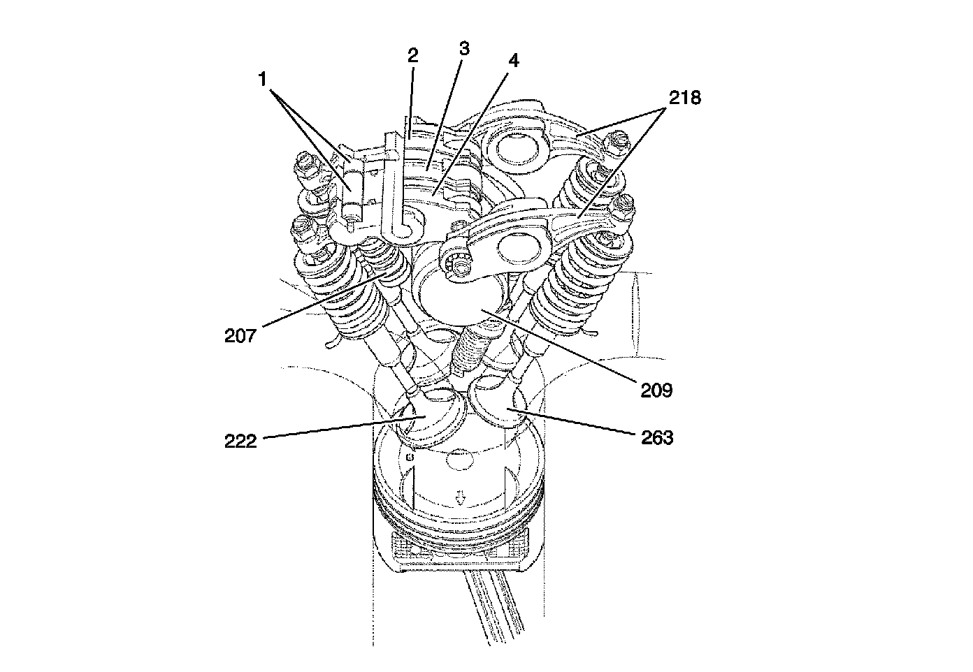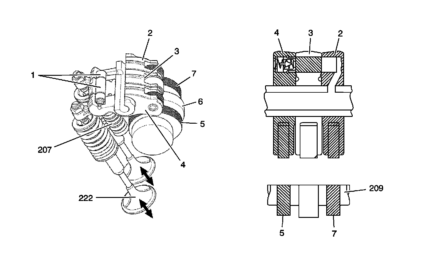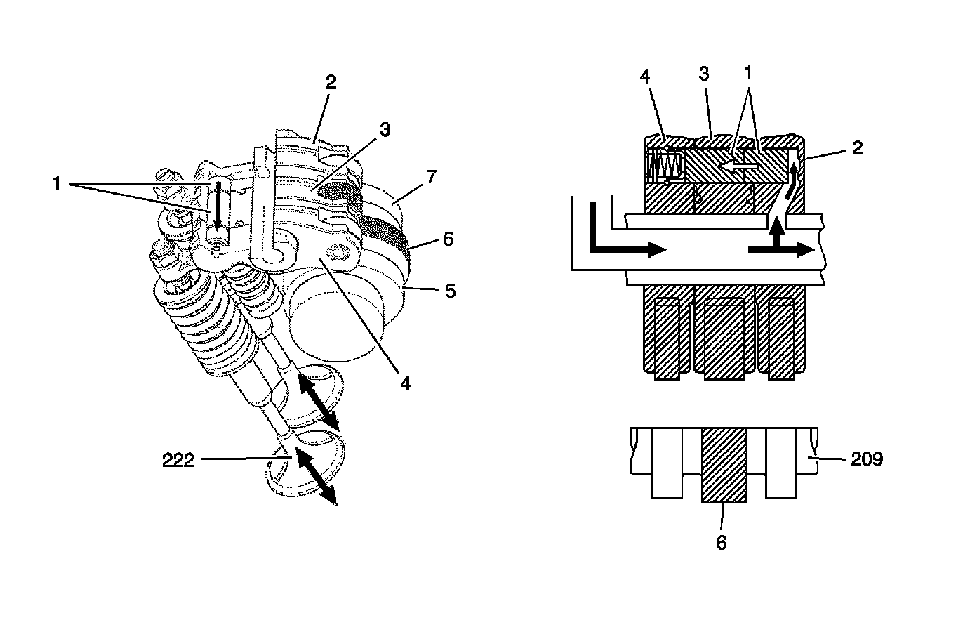The primary (4) and secondary (2) rocker arms are not connected to the mid rocker arm (3) and are driven separately by the camshaft lobes (5 and 7). Even though the mid rocker arm (3) is following the center camshaft lobe (6), it has no effect on the opening and closing of the valves in the low RPM range. The valve lash adjuster (207) absorbs the lost motion action of the mid rocker arm.