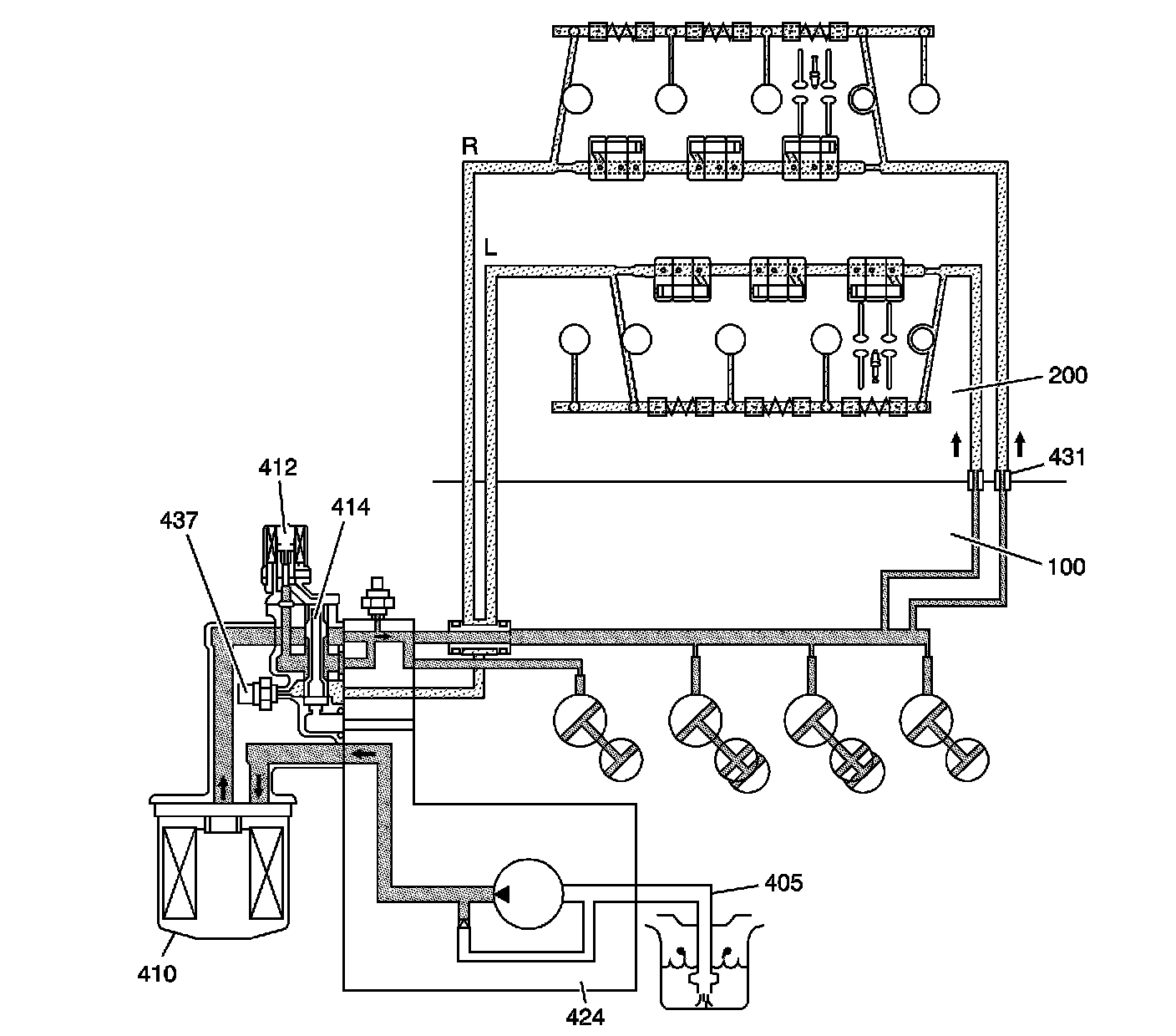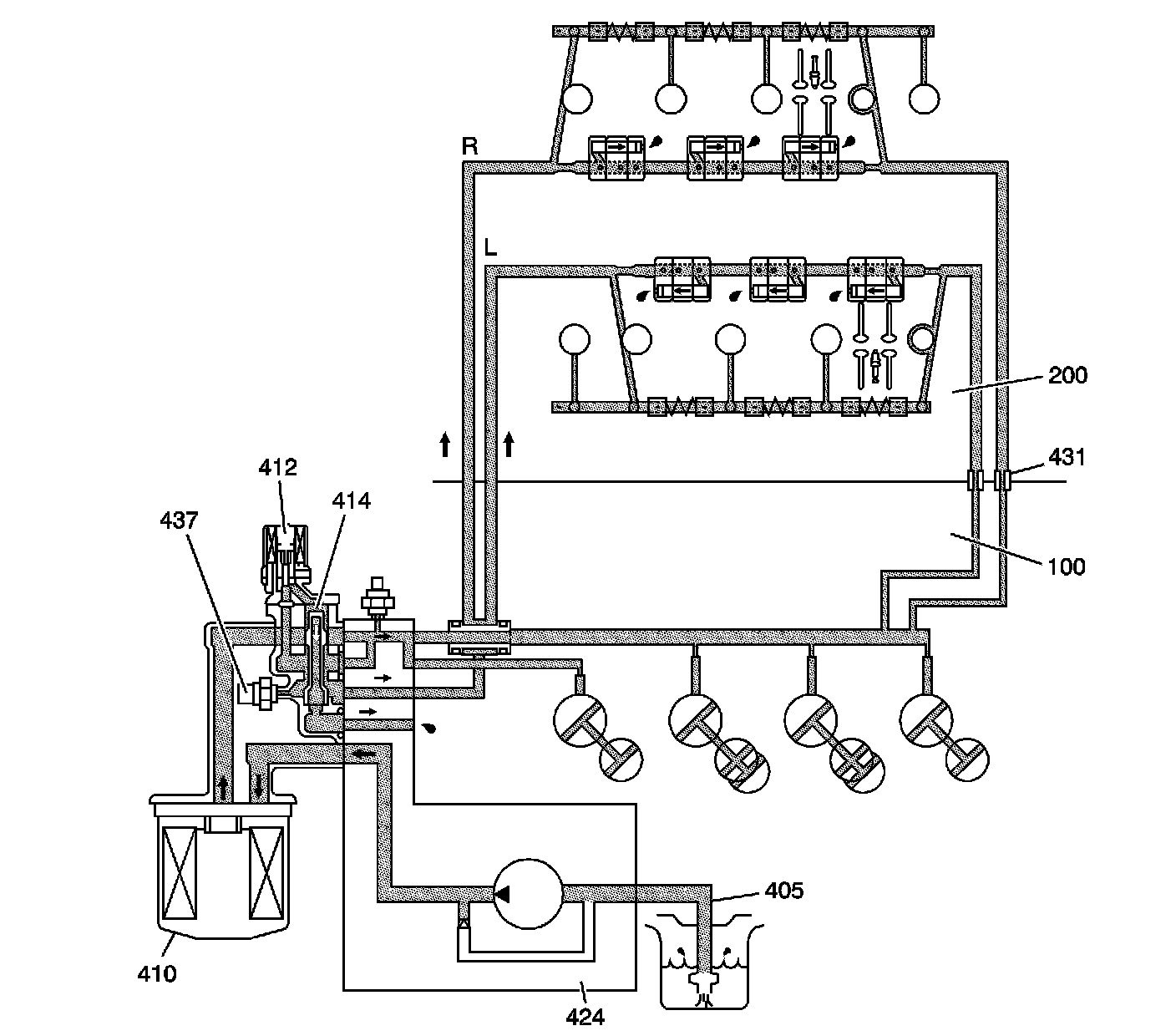 The oil is pulled from the oil sump through the screen (405). Oil pressure generated in the oil pump (424) is supplied through the oil filter (410) to the engine block (100). The oil pressure is then directed to the cylinder heads (200) for rocker arm and camshaft lubrication. The oil restrictors (431) located within the upper engine block reduce the oil pressure to eliminate intake rocker arm piston actuation.