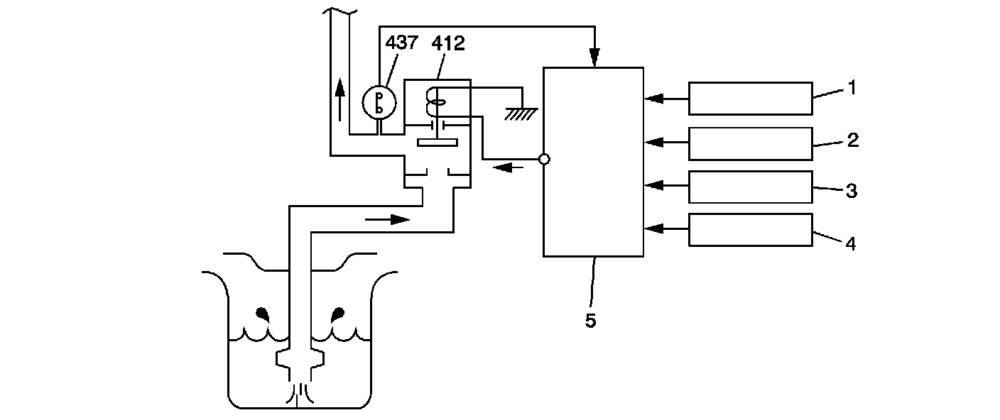 The PCM (5) constantly monitors the changes in engine status, such as engine speed (1), engine load (2), vehicle speed (3), and coolant temperature (4). The PCM directs the oil flow control module (412) to provide higher oil pressure to the intake valve rocker arms as required. The oil pressure switch (437) provides a signal to the PCM that oil pressure is present.