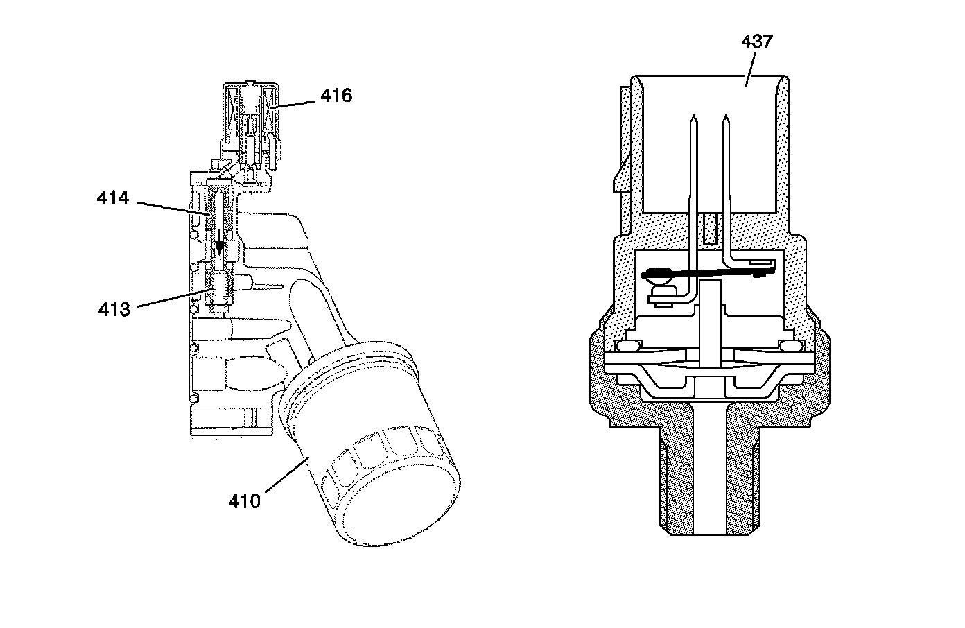 The spool valve assembly, or oil flow control module, is mounted to the front right of the engine block at the oil pump housing. The module consists of an oil filter (410), solenoid (416), spool valve (414) and spring (413). The module controls oil flow between the oil pump and the synchronizing pistons of the intake rocker arms. When the solenoid is activated, the oil pressure pushes the spool valve downward. The spool valve then opens the oil passage, and hydraulic pressure is applied to the synchronizing pistons, thus activating the intake rocker arm control system. The oil pressure sensor (437) is located on the housing by the solenoid valve and is in a normally closed position. The switch is used to detect oil pressure and to activate the intake rocker arm control system. The PCM provides 5 volts to the switch, the switch opens through the body, the solenoid is energized, and oil pressure applied.