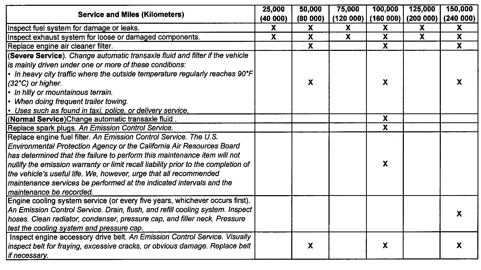 service (I or II) after the indicated miles (kilometers) shown for each item.